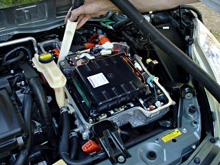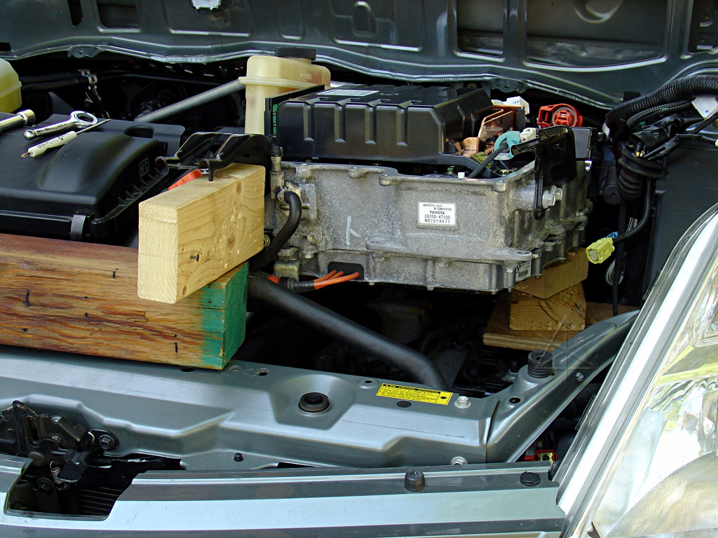Clarification Let's be clear here. The following exploratory procedure is *not* how you want to be doing routine transaxle-fluid changes. What wound up being detailed here has apparently confused the Prius community for some time, and y'all have my profound apologies for that and any extra work it may have caused. For a more routine procedure, albeit with the caveat that you cannot remove the bottom pan on a second- generation car, see this page in which we changed the fluid on a first- generation car that had possibly never had it done. So no, you certainly don't have to uproot your inverter every time you go to change the tranny fluid. Just drain and refill with your Very Long Funnel at the front inspection plug and be done with it.