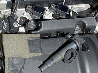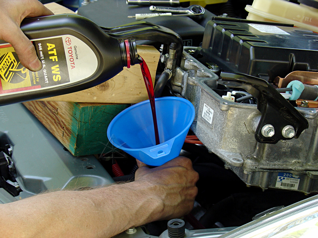 Now, a lot of this basic fluid-change operation could have possibly been short-circuited and all done from underneath using some sort of pump or squeezie-thing to push the new fluid in through the level-check hole. That would have been the efficient, just-get-it-done method, and possibly somewhat messier. But the exploratory look inside and under the inverter is definitely worth the time, as are the various other fixups around the engine bay.
