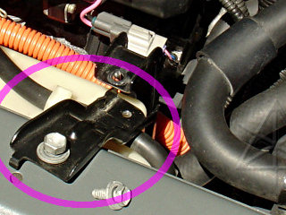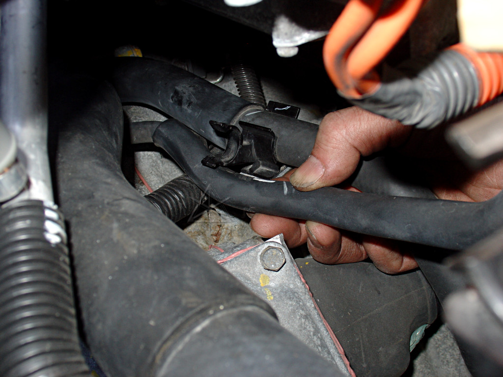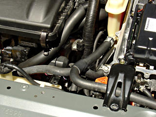 Tease both inverter coolant hoses up out of their clips -- note that the one toward the passenger side neatly clips in along the bottom of the engine coolant tank. Raise both hoses up above their clip points, so they can follow the inverter when it gets lifted. Take note of the thinner coolant bleed fitting and hose on the front of the inverter; this will be one of the main movement limiters.
