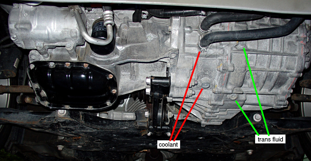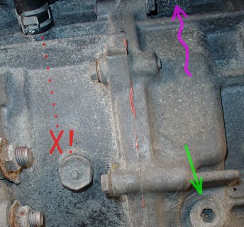 Now we shift perspective to underneath the transaxle. If necessary, lift the car slightly to unload the suspension and get more room underneath, just like when changing oil. There are TWO drain plugs on the transaxle -- we DON'T want the one for the coolant [red X!] -- we want the plug with the 10mm hex hole in it [green], that inexplicably does NOT look like the top or level- check plugs whereas the coolant plug does. And of course both fluids are pink. Look at the big picture for, well, the big picture. A good mnemonic is that the coolant plug is in-line with where the two lowest hoses go in and out of the case. The tranny-fluid level-check plug is off vaguely in the direction of the pink arrow. Don't open that one yet, since it is likely to dribble fluid now and and may let new fluid splash out during refill. If the inverter was to be removed completely, at this point you'd only have to drain the coolant from the other plug and unhook the three hoses up top. But leaving that loop intact avoids some amount of mess, exposure to outside air, and then having to bleed the bubbles out of it.