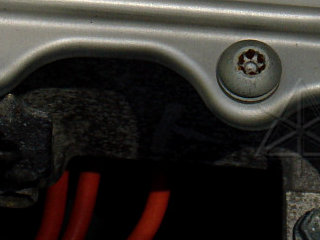 The inverter is held in with three largish bolts -- the third one of which is fairly far down behind the inverter. Look straight down, you'll see it. Between the three of these, one bolt hole is small, one is slotted right/left, and one is larger and round. This allows easy matching to any variations the car body geometry may have. Now, this part isn't necessarily for everyone. The inverter is fairly heavy, and as it moves around it shouldn't be allowed to sit its full weight on anything delicate such as brake lines or hoses or wiring. Get help to lift and hold things as needed. The first thing that should be done once you can get a hand underneath the inverter is unclip the small coolant bleed hose from where its midpoint is held to the transaxle case. Follow it down from the bleed fitting on the front, and see some of the later pictures for how it's fastened in. This will allow the inverter to rise farther.