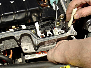 There are THREE access points to the transaxle fluid -- the drain plug, the level-check hole on the front of the case, and one that is rarely mentioned on *top* of the transaxle case. This latter seems like a logical place to refill from, since trying to get oil to flow horizontally into the level check hole would take a *very* long funnel or a lubricant pump. It should be noted that the Toyota service manual does specify refilling via the level-check hole with a pump or a long tube, and is likely a faster, less involved process. However, one goal of this project is to see how far the inverter can be shifted upward/around *without* having to drain its coolant, to access any items underneath or the sensors on the left side of the engine. With the '04+, there is actually a bit less stuff hidden under the inverter than in the Classic, but many service procedures still begin with "drain coolant and remove inverter", so it's time for a sanity check on just how necessary that is. At any rate, it's definitely got to be displaced to allow access to that top transaxle fill hole, so here's how to go at it. Use the image links to the larger pictures to clarify everything.