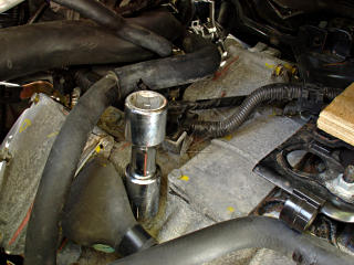 With the hoses out of the way, now you can finally clean around that top plug and get a wrench on it. 24mm, but 15/16 is very close to that if your only "huge sockets" set is english. It's useful to open this first, because the fluid will drain much more nicely without going glug, glug and making a mess. Now, as I cracked this plug, I noticed a *long* period of hissing air intake. As noted by various forum members, the transaxle evidently accumulates negative pressure, which seems odd and a higher risk for dirt ingestion, but given that pressure relief clearly happened as the plug was opened it appears to have remained sealed without mishap so far. Upon reflection, negative pressure is clearly better than positive pressure -- it would help keep various seals from leaking [notably, the axle seals, which have quite a bit of radial slop]. The air fitting on the MG1 connection cover [very left edge of the picture, partial] is some sort of one-way valve to let air out, but not in. Here's a deep study of the equivalent valve and its function on a Classic, and a pressure-relief breather mod.