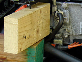 Support the inverter as high and as well as possible, using any available objects. Wood blocks are good. The main limiting factor is likely to be the bleed hose, and to a lesser extent the inverter radiator hoses. Again, make sure the back end isn't resting on the brake piping; use additional supports under the rear bolt bracket. The inverter can be solidly supported up this high, which is enough.