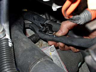 Remove this bracket, leaving the section that wraps around the A/C hose.