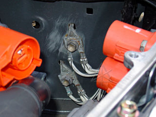 Might as well go after and clean up these ground points, too. In this case one of the bolts was starting to get a bit of corrosion [well duh, it pokes through into the fenderwell], and received the benefit of a little emery paper around the hole and a touch of anti-seize on the threads. The same was done not too long ago on the similar pair of ground points over on the right fender, when the windshield-washer tank was out. Bad grounding points are frequently responsible for all manner of subtle car electrical problems, because they're often overlooked as causes.