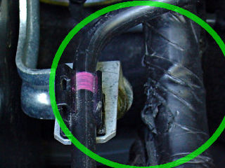 Here's another potential cable rub point. The primary 12V converter output lead and some other stuff passes very close to, if not touching, a bracket for a brake line. I see a little shredded tape here, although there's also a hunk of split-loom plastic around it. In this case the best fix is to be to simply bend the harness the other way, where it seems happy to stay. That 12V supply wire is fairly stiff.
