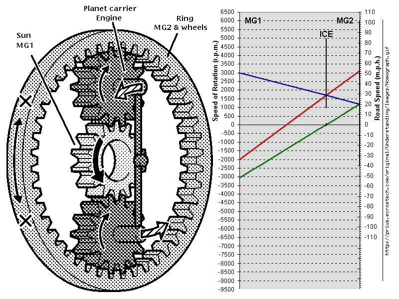 Let's remember that the definition of Neutral in a Prius is, "no control is applied to the electric motors". That's what it is, electrically. Both inverter gates drop, and the motors free-spin. Mechanically, of course, nothing changes at all since there's no physical gear-shifting. Starting or stopping the gasoline engine is a secondary consideration, which cannot happen if the hybrid ECU is commanded to not have any control over the electric motors. This also implies that the best method available for sensing engine output torque is electric motor/generator current vs. switching phase, as the motors have to essentially fight the engine's rotation to transfer torque through the PSD and deliver usable power to the wheels. Thus, if the engine up and and dies when the Prius expects it to be delivering power, an error condition is set. If the fuel-cut switch is left turned off long enough to stall in any shift position other than Neutral, the resultant "christmas tree" of dashboard lights is similar to what happens when the car runs out of gas. If the shift state is in Neutral, then fuel flow to the engine can freely cease and it eventually stutters and rattles its way to a stop and the hybrid controller just doesn't care. The hybrid controller *knows* the engine isn't running since it also monitors a copy of the crank sensor for RPM and position, but it's not an error condition unless the hybrid system was depending on solid engine output at the time. If control is later granted by shifting out of Neutral, the hybrid ECU has the option of restarting the engine if needed. If the pump switch is off and the Prius goes to start the engine but finds that it won't stay running, it's a slightly different error condition -- the dreaded P3191, "engine failed to start". Owners of older cars whose throttle-bodies have never been cleaned may be all too familiar with that one, as that can cause a similar no-start condition but for the wrong reason. The car may try to light the engine up to three times before deciding it's out to lunch and throwing the DTC. Either way, once the system is in one of these error states it allows much more use of the battery for propulsion -- close to its current limit of 100 amps, and down to a frighteningly low state of charge before ultimately cutting off that energy source too. This is the "high speed EV mode" that some of the plug-in conversion vendors are claiming to be able to do, but it's a cheat -- they deliberately throw the car into an error condition and take advantage of the fact that it allows substantially more battery use for a while. Toyota probably allows that slight excursion outside the normal parameters as a safety feature, allowing a driver to limp off a highway and go a short way in EV after running out of fuel. But it really isn't the way you want to be routinely running the car. The PHEV hacks generally don't go after the fuel pump, as it takes too long to generate the engine-croaked condition and shudders a lot in the process; they instead do things like cutting 12V ignition power to the whole engine ECM which is an instant error for the HV controller. Some of them even go as far as immediately clearing the error condition via an OBD-II mode 4 command on the CANbus, just to turn off the big red triangle, but at that point the hybrid ECU has given up on using the engine at all and that state doesn't clear -- the entire car has to be shut down to restore normal engine operation regardless of whether the dashboard is lit up or not. And if you were hoping to go to emissions inspection later that day, forget it -- none of the EVAP and catalyst monitors will show as completed after such a recent OBD-II reset. So it's still a klunky non-solution that is being routinely misused by these folks and sold as a product feature. Buyer beware. They'd be much better off to build up [and/or spoof] enough SOC to widen the car's warp stealth control threshold and encourage it to push more meaningful battery current into highway cruise with the engine still turning but not injecting fuel, as it's still a very low-friction state. There's really no need for any extreme hacks; the car already has a perfectly good high-speed zero-consumption running state available. At this point I can offer some seat-of-the-pants pseudo-proof that we don't need to be so uptight about having the engine at a standstill. For a little fun on highway downhills, as touched on in my mountain journeys, the fuel switch provides an alternative to warp stealth if your foot needs a rest. It's the same state as reached by gliding at < 42 MPH, going to Neutral, and coasting up to faster than that. But this can be initiated at higher speed. The shifter can be put in Neutral and the switch cut, and in about ten seconds the now-idling engine will cough and die and the hybrid controller just goes on happily being in Neutral and ignoring it. At this point the switch can be re-enabled for the next run. At highway speed, the stall spins MG1 up pretty high in the reverse direction [see the nomograph as a guideline]. This can actually be felt as a perceptible slow lurch. Interestingly, the difference in mechanical drag between engine-spinning and engine-still seems almost nonexistent, as though pulling the engine around at 960 RPM or MG1 at 9600 or wherever with the associated rotor windage and stator reluctance creates about the same power loss. It's actually a bit of a mystery why this doesn't slowly pull the engine around against compression, because there's *got* to be some amount of leftover torque applied to the crankshaft even with electrical motor-control disabled. Going back into Drive immediately brings the engine back up its warp-stealth spin speed as MG1 slows down under re-established inverter control, as though nothing were amiss. My informal butt-dyno and MPG-tracking conclusion is that there doesn't seem to be any particular advantage to "warp neutral" coasting at interstate speeds, other than t