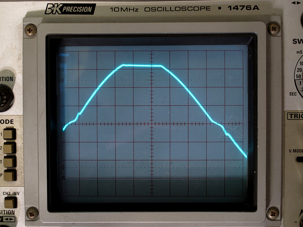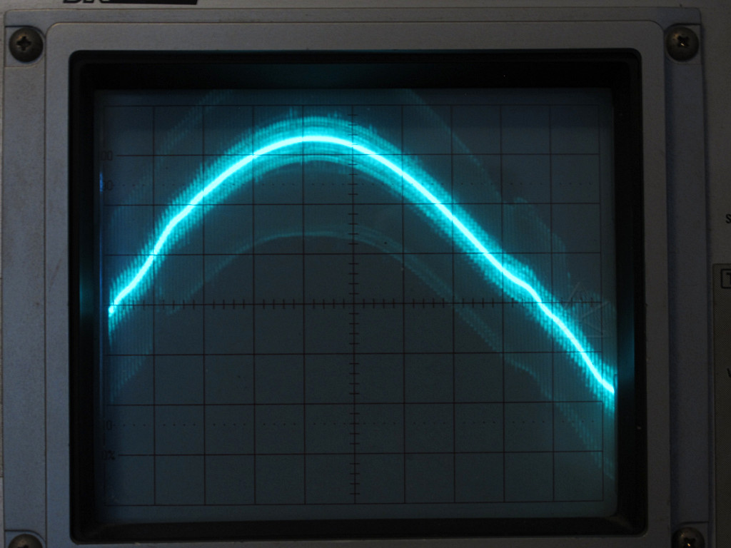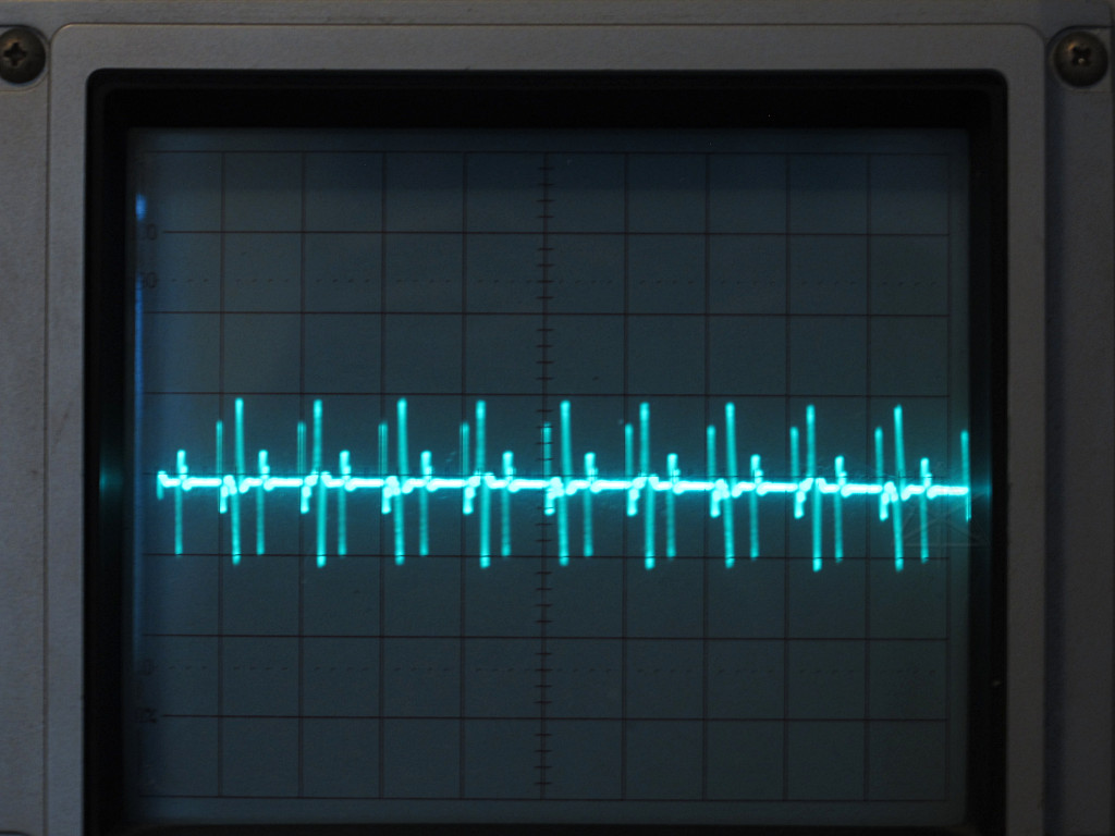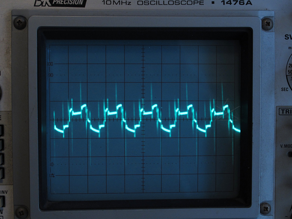 This is about 0.1 ms/division again. Remember how we observed that the Prius battery ground-fault detection uses about a 5 KHz signal? Here it is. |