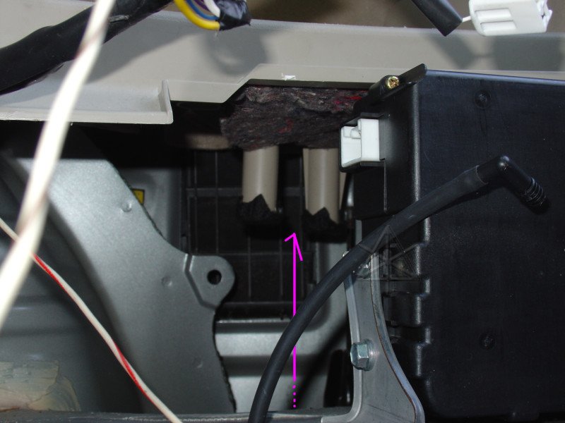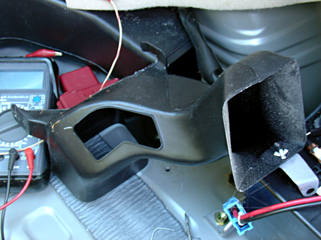 Next step was to disconnect everything else and pull the battery out for further study. The final section of the HV battery ventilation exhaust duct had to be pulled first; as I did so I noticed that there's an extra hole in its lower side, sort of aimed into the 12V battery area!
