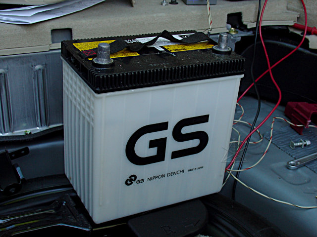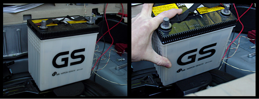 They could be cut down to fit a taller one, of course, and the metal holddown strap would have to be jacked up on a spacer at the inboard end. The threaded rod on the outer side has about an inch left above the nut. In general there is quite a bit of extra room in the overall area for those willing to attack the stock bracket or fab up a new one. As I reinstalled the battery, I dropped a piece of thin self-sticky foam pad on top of the bracket to cushion the bottom of the battery a little. Otherwise it's direct metal contact over a relatively small area since while the bumps in the bracket meet on the same plane, their area isn't very large. When my GS starts dying, I suppose that in a pinch I could always plug one of my modded UPSes into the Anderson connector and boot the car from it, and drive around with that rig until a real replacement is found. With only 30 amps really needed to boot up, the workaround possibilities are numerous.Slowly [?] back to life