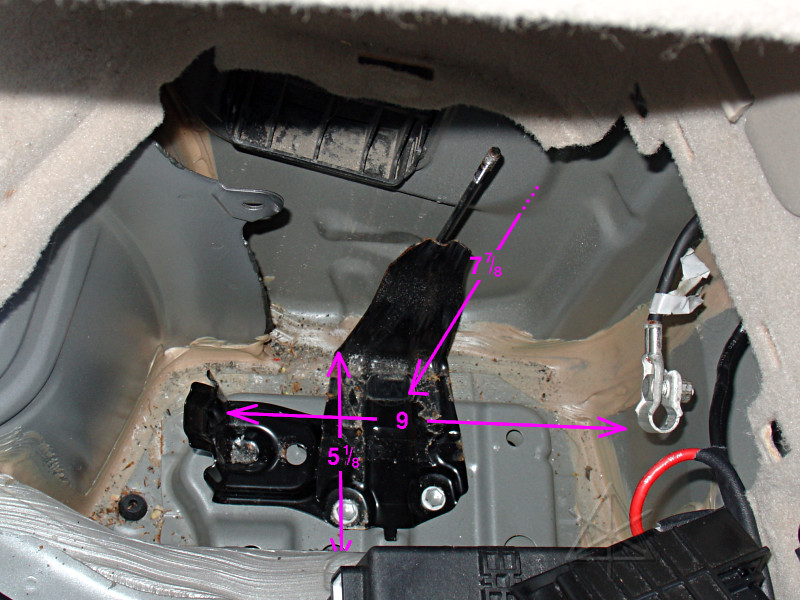 ... and the vertical distance is bounded by these felt-tipped pegs sticking down from the hatch floorboard, which at 7"7/8 from the bottom land exactly on top of this battery and help structural support of the hatch area.