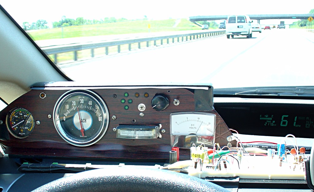 The Prius has no step gears, of course -- its output ratio comes from an computer-defined torque balance between the two electric motors across the planetary gearset, and the computer meanwhile gets to handle the throttle opening as it pleases. It presents a different way of thinking about engine control, and can be problematic for drivers to get used to. In my own experience, it seemed as though I was stuck running in higher RPM ranges at highway speeds at the expense of good MPG, and couldn't quite figure out optimum strategies -- if it's better to try and pulse the engine hard and then "warp stealth" to glide, or just try to bring everything to a steady state and hold it there. I already knew the cruise-control is *way* too aggressive about holding an exact speed, and that while some owners are perfectly happy to just let the cruise-control do its thing on highways and deliver mid-fifties MPG at best, there had to be a better way. Interestingly, it has often been through talking with Honda Insight owners that I've learned the best ideas about high-mileage driving technique. With the Insight's traditional throttle linkage and transmission, drivers get much more manual control of their gearing and throttle settings, which when properly played can easily return 100 MPG for them. They also have the advantage of lean-burn, which does require a lighter load on the engine. But then trying to plow those ideas back into how the Prius operates has been a bit of a struggle since it seemed like I had much less control over the throttle and powertrain output ratio. It seemed impossible to duplicate the high-torque, low-RPM "almost lugging" methodology of running through the gears quickly while accelerating and get into the highest gear as soon as possible. It always seemed like if I wanted to go a reasonable speed on the highways, RPM would automatically climb into areas of more fuel consumption. So the big question became, "how do I get the Prius into the equivalent of high gear earlier in the game?" I started occasional discussions about this in the Prius technical forums, which were somewhat inconclusive but allowed me to bring my own observations forward to see if anyone else had ideas or followups. Shortly after getting aboard the "hypermiler" hangout at cleanmpg.com I posed the questions again and some of the condensed observations and thinking to date, but even the discussion there was still rather inconclusive. There were several half- formed theories about the Prius, but nobody seemed to have the answer yet. That exchange is still worth reading, because at that point in time I didn't know but was SO CLOSE to finally getting it: http://www.cleanmpg.com/forums/showthread.php?t=915 The answer had been sitting right there in front of my face the entire time. The very first instrument I ever played with in this car, in fact, was my old vacuum gauge left over from previous projects, and after driving around a little with it I was *completely* mystified as to what the Prius throttle was doing. A vacuum gauge is a good "how hard is the engine working" indicator, since a larger throttle opening resists engine suction less and lets it pull more air/fuel mixture through the cylinders. Traditionally, a vacuum gauge tracks the inverse of the accelerator pedal position fairly linearly, dropping to zero at or near full throttle opening. But with the Prius, the throttle is controlled electronically and completely decoupled from the pedal. While I didn't always understand exactly what it was showing me about the Prius, the vacuum gauge has been part of my extra-instrumentation panel since the very beginning and has been useful when trying out yet another theory about efficient highway travel. At a minimum, I knew that when the vacuum began to rise away from 5 inches of mercury, that the engine was likely to be "loafing" -- still burning gas, but inefficiently and not providing any appreciable power, just heat. But with new factors like the Atkinson-cycle engine and computer-controlled throttle, I couldn't be sure about the possible causes of what I was seeing in the gauge. Before the trip out to Hybridfest 2006 in Wisconsin and back, I had also begun playing with monitoring fuel injector pulse time and duty-cycle percentage. This started with simply watching it on an oscilloscope and eyeballing some timing, and then once I understood what that was doing I started playing around with some circuits to integrate pulse times and display proportions as a voltage. Through a bit of dumb luck with some components stuck into a prototype circuit, I seemed to have given myself a meter that would start reading just as low vacuum was reached, and crest at 10 volts as vacuum headed a little lower yet above 2300 RPM or so on the highway. A conceptual 0 - 100% display of what I believed would be an efficient range, in fact. With all this sitting on the dash as the typical breadboard bristling with parts, I set off for another 2500-mile learning experience. And the running MPG during that trip was respectable -- north of 60 the whole way, at speeds between 60 and 65 MPH. "Sixty-three at sixty-three", I started calling it. Nicely above the EPA numbers, especially the highway rating for the Prius -- and I began believing that it was due to letting a little needle waving back and forth govern what my foot was doing. Maybe it wasn't perfect, and there were still other techniques I could be doing to get even better, but this lashup was doing more for my running MPG than anything prior. But on the way back from Hybridfest, the real epiphany came to me. It was an observation that lasted only about a quarter-second, but which completely confirmed all of this new thinking. I was on some secondary highways in Pennsylvania, and had just come down a fairly large hill that had run the battery up to its displayed "full" at 80% SOC. In that state, the hybrid system often tends to get a little confused and try to do things to bleed off s
