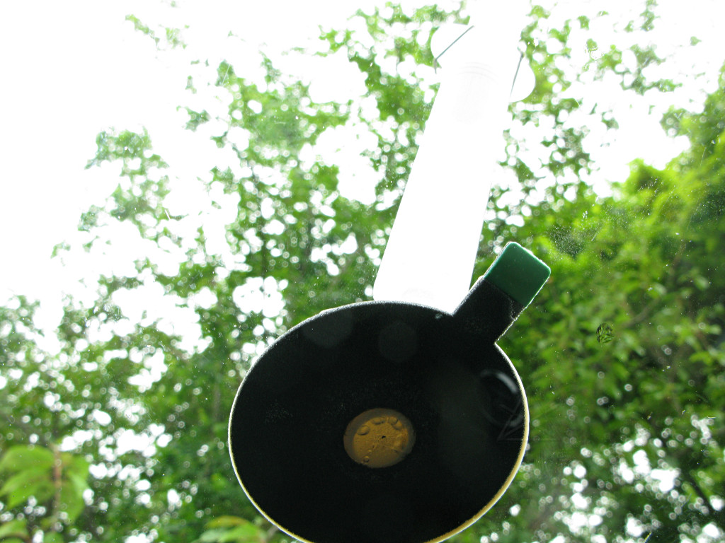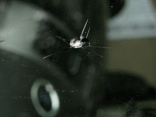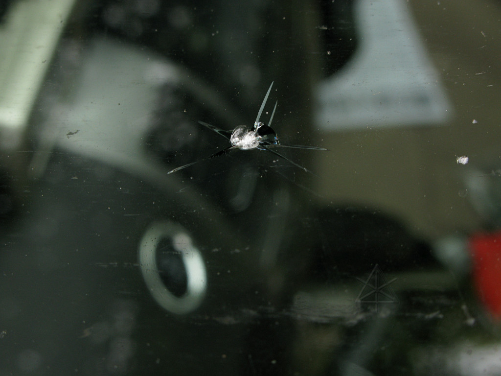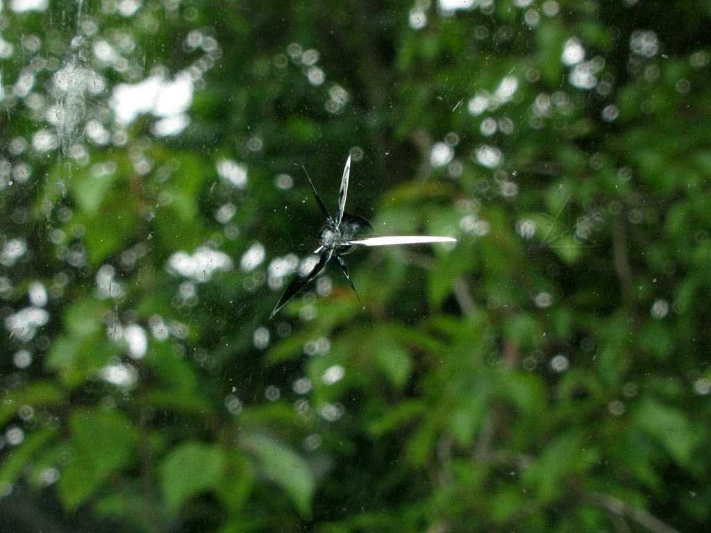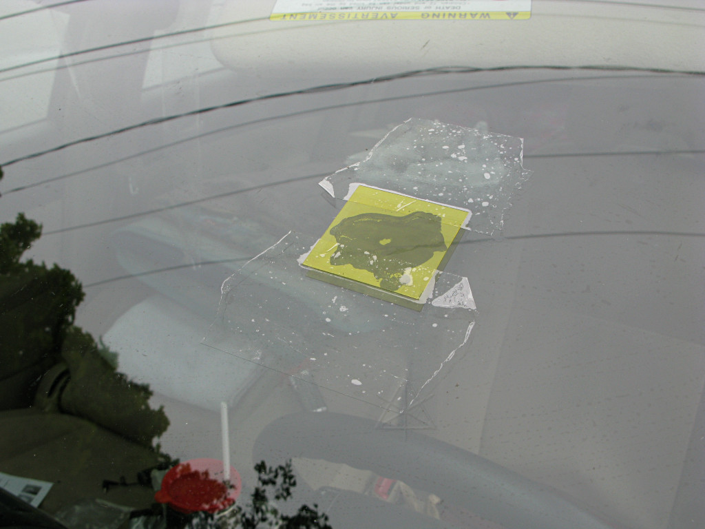 I was just heading out for a brief roadtrip to the Cape, and part of my route to the highway goes past a gravel supplier. Their dump trucks are always pounding in and out of the area and they're usually pretty good about load securement and using the load covers, but they can't be totally certain what happens over the occasional big bump. As I approached the highway one of their trucks went by the other way and probably slammed over one of the still-unpatched holes near the bridge expansion joint, because the typical boom I could hear from that was quickly followed by a loud *KAK!* and I realized that something new had just appeared slightly above my sightline and it wasn't a squashed insect.  |