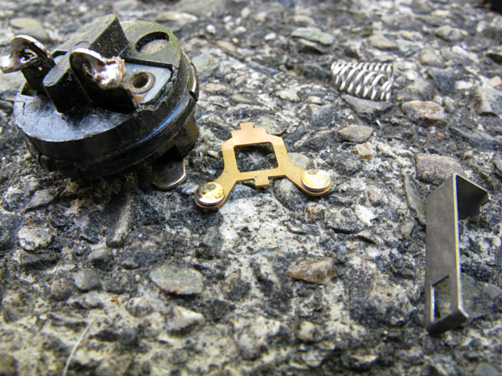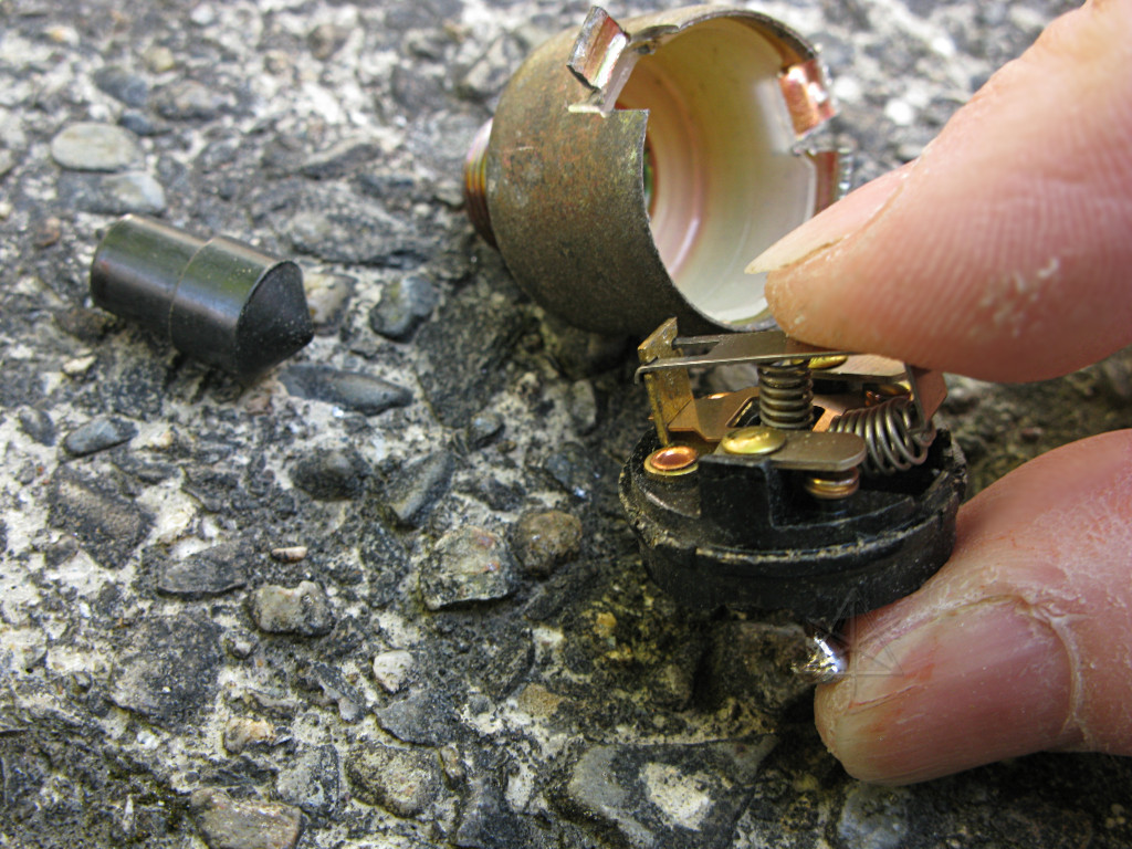 | Button borkage A few days after the foot-switch rework, the Button stopped working reliably and soon pretty much stopped working at all. Fortunately I wasn't far from home, because already I felt naked and helpless without having it fully functional. My Yuppie Button had turned into a Yucky Button! A little electrical isolation revealed that my wiring was still fine and the new switch itself was at fault, not actually connecting its two leads reliably. As a> such events are relatively rare, but b> the switch was not actually all that new itself but from surplus or disassembled gear, some analysis was in order. We do know that switches can fail in such a manner -- look at the recall on the original 2004 Prius brake-light switch, for example, which replaced it with a different type less subject to degradation. |