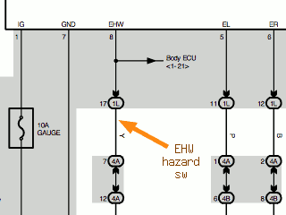 This in conjunction with the circuit diagram and connector-location list, as usual, narrows down where to splice in connections. One +12 supply line is needed, taken from the IG-ON switched "gauge" fuse and brought in through a diode to avoid letting the always-on brake-lights circuit back-power the meter assembly when the brake pedal is pressed. [If you heard a soft "oops" muttered in the distance here, you heard correctly...]
