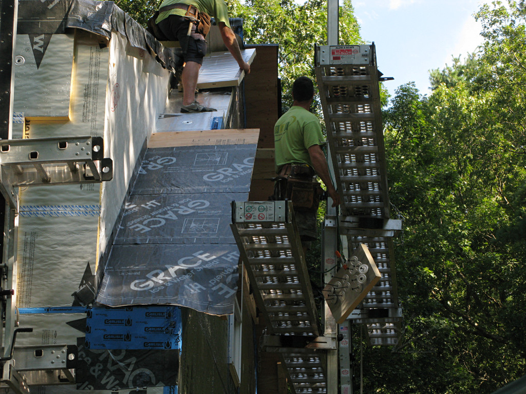 Here the roof-to-wall transition had already been done and buttoned up, and the outer row of screws under the leaning guy's right elbow went down into the original gable-end rafter of the house -- now sitting four-plus inches inboard of the end wall plane.