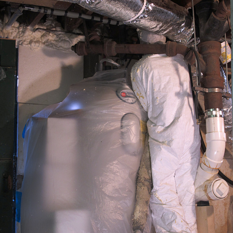 It didn't take long to work around to hit the difficult area -- behind the water heater, plumbing, and HRV vents which they said were fine to stay in place even though I'd offered to disconnect the HRV intake. They probably work routinely in much tighter spaces than this. He just went along in little pieces and didn't try to hurry, which is the right way to approach this as successive passes to build layers really need some settling time in between. It was also handy that he could just step up onto the HRV table.