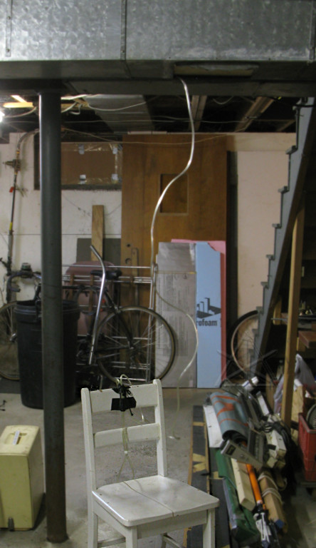 I thought of constructing some sort of low table for the heat-recovery ventilator [HRV] that would eventually arrive, as I didn't want to chain it up to the joists in the typical way they get installed. This piece was about the size I was thinking of and I'd just recovered a small handful of 2x4s of some rather dense wood. They'd make fine legs for something like this. So in the bit of space cleared in front of the coal mess I started throwing together the HRV table, which after the addition of a couple of diagonal braces later worked out perfectly and fit exactly where I ultimately intended it to go. That way any HRV fan vibration would be coupled to the basement slab rather than the floor above, and wouldn't transmit noise into the house structure. |
