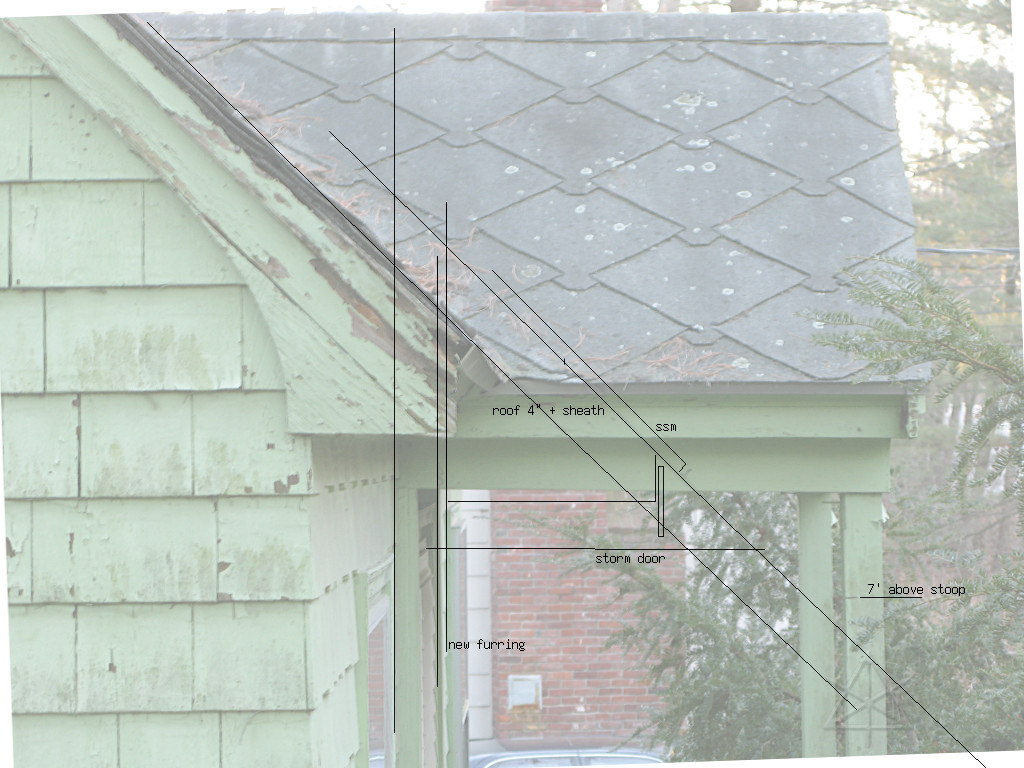 | The stink-pipe changes to PVC just below the iron because that's what they installed on the Title 5 septic-tank replacement just before I bought the place; there was no way *that* alone was going to hold up the rest of the pipe if it ever decided to slip. On the bright side, the iron/PVC transition gave me an idea about what to do at the other end where it penetrates the roof, i.e. do the same in reverse before going through the roof deck to reduce thermal bridging past the insulation. I floated this concept to the Synergy guys, and they thought it was a great idea. | |