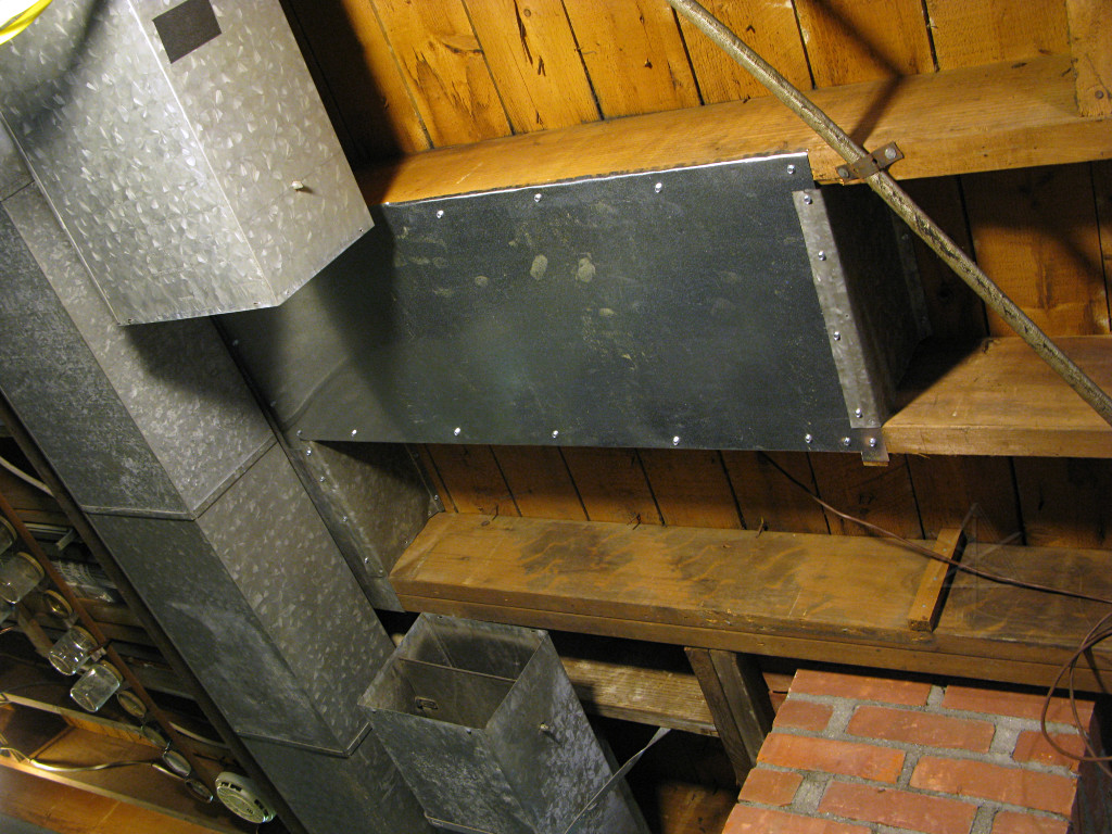 One simple idea came while putting some of the ductwork back together: I realized that simply keeping an end cap off one end of the return system would cause the air-handler to pull primarily from the basement, thus supplying already-cooler air that would probably need a bit of drying anyway. I flattened the locking tabs and added a pair of nice handles, making it an officially removable piece and a beautiful solution to the basement circulation and drying problem. Well, once I had an air handler again. With a supply register for the basement area already present at the other end, it would allow for nice circulation of conditioned air down there in addition to upstairs. It was a passable theory, anyway, as I looked at the completely disconnected duct ends hanging over the furnace pad without any good way to push any air through them. Fortunately the weather was generally nice and I could pull a little fresh air through the place using the front door stormdoor and the like ONE openable screened window I had left. The hack dehumidifier kept the basement under reasonable control in the meantime, but I could tell that the warm-weather humidity was already trying to seep in. |