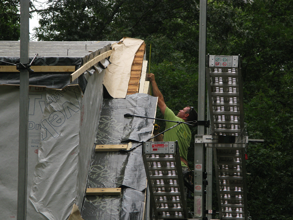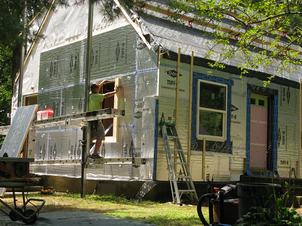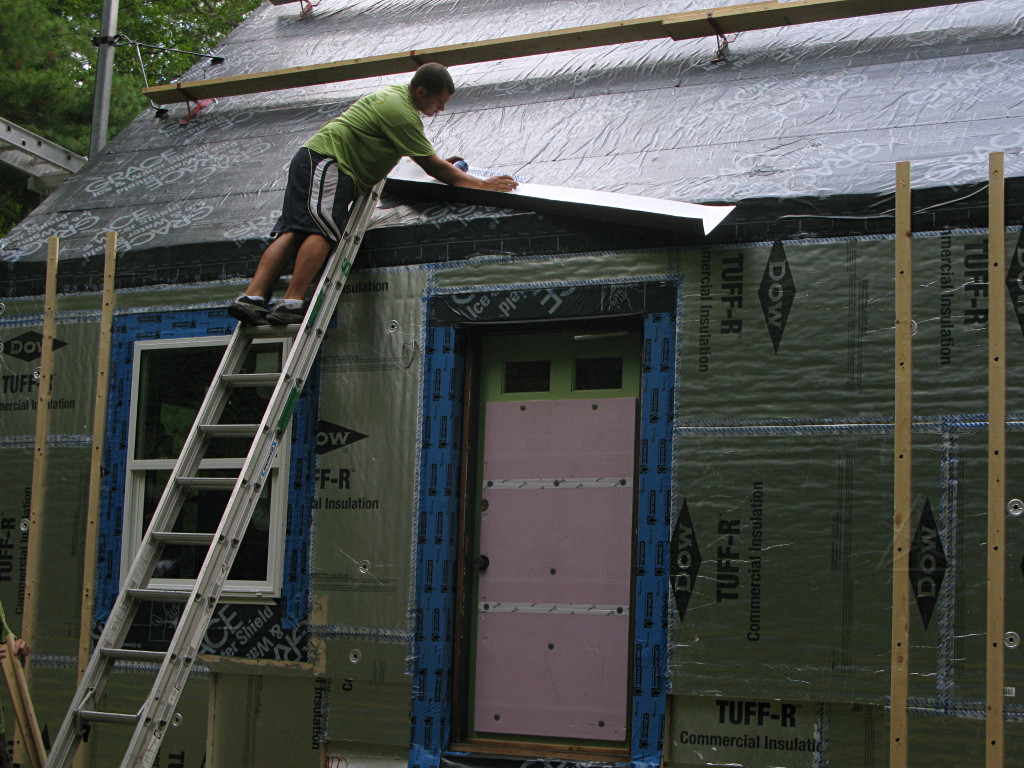 With the windows all installed east and west, the guys were getting near the roof peak. Note how the foam is exactly flush with the roof sheathing, continuing the plane of the wing-wall roofline. |