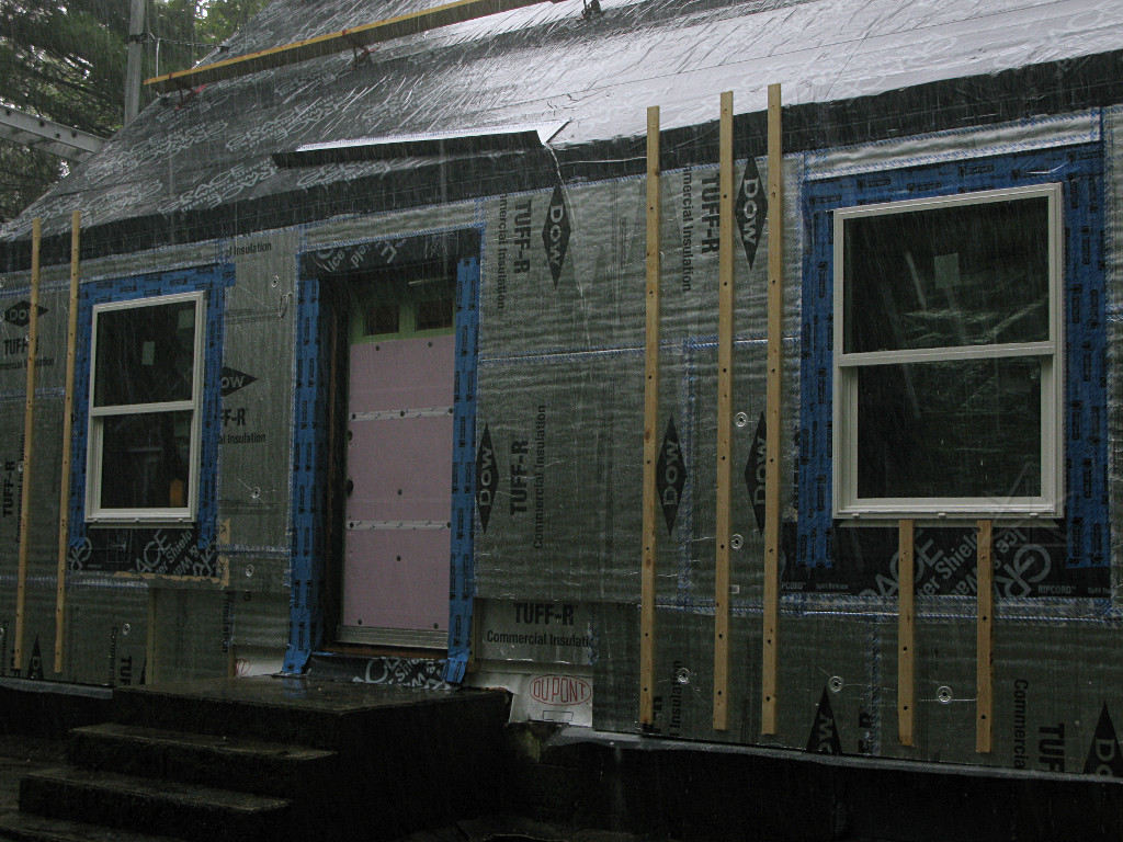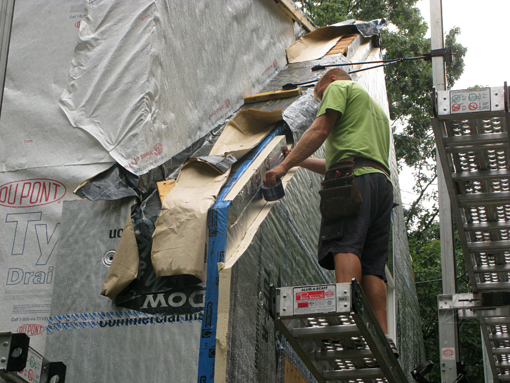 On-the-job training in action. They went around and took care of most of the areas they could easily reach, but not every possible point and it was sort of too late to revisit all of the horizontal tape seams without some undesireable effect on the surrounding materials. You can't just rip this off the foam without taking the foil-face with it. At least one case study I had read recommended using little handheld rubber rollers on construction tape to stick it down really well, but that would have increased the crew's workload even more. We acknowledge that the outer face of the foam *is* the supposedly weatherproof cladding for some number of days during the project, and that due care is needed on these details. Some recent recommendations from Building Science even suggest shifting all horizontal tape applications upward to get more adherent surface area above any breaks in the external plane. | |