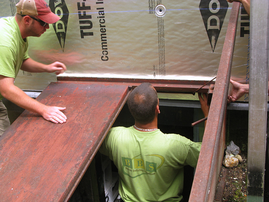 It was almost like a race, with two more guys working the west wall the same way, and whoever was on the ground frantically trying to prep and pass them materials. |
