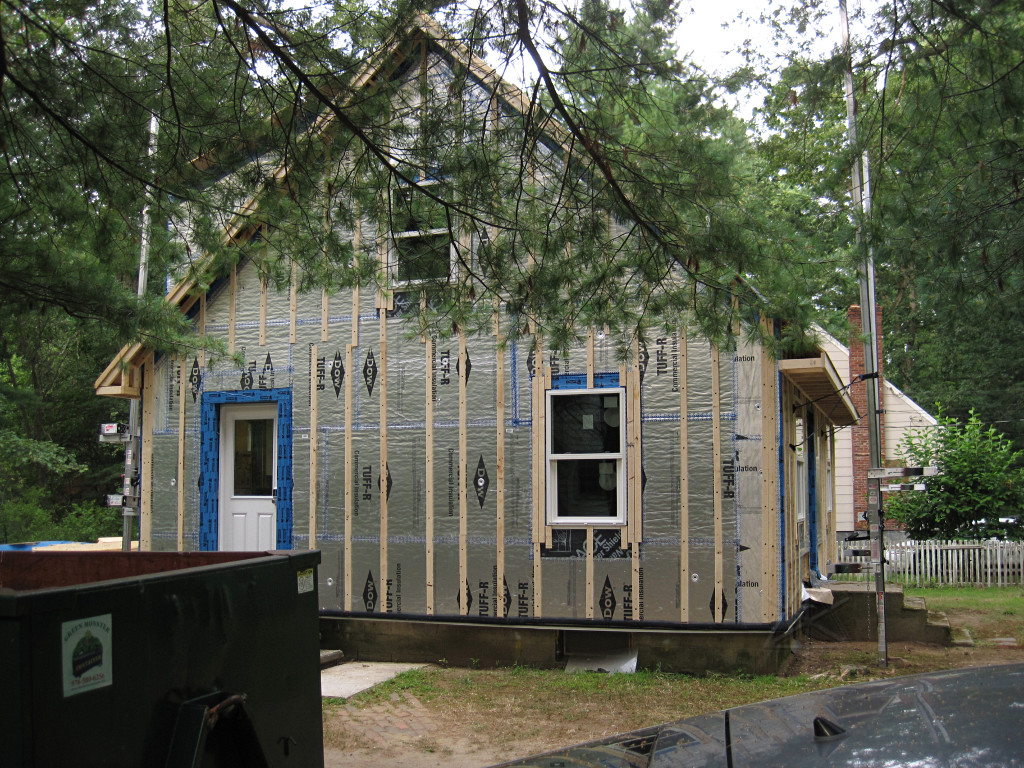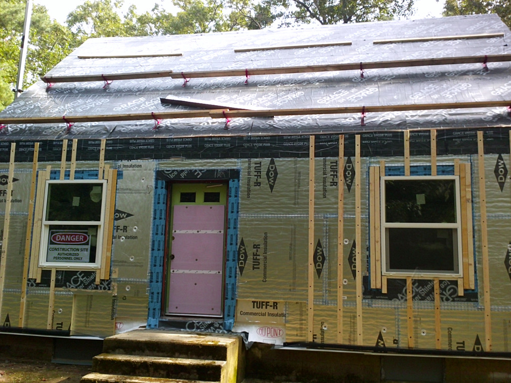 As on the front, the assembly of foam, plywood, and Grace proceeded upward toward the peak. |