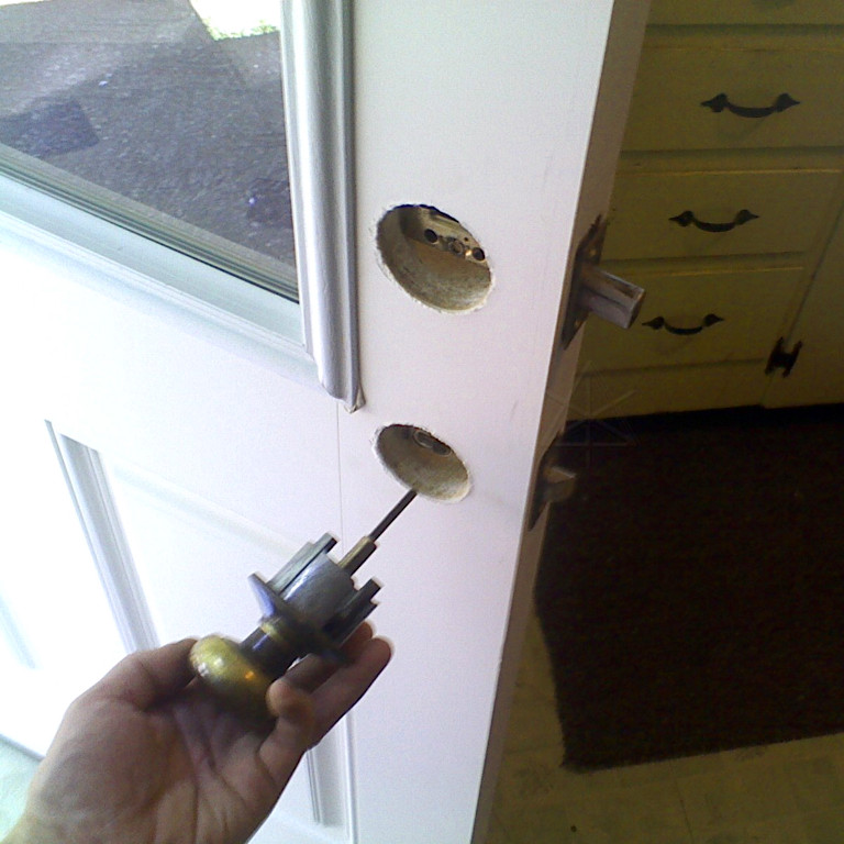 The nominally "fiberglass" door unit turned out to be fiberglass cladding over a wood and foam core, with the cross section clearly visible in the lock holes. This didn't appear to be an actual ThermaTru door like we had talked about getting ... in fact it didn't seem to carry any particular brand at all, and may have been simply assembled in Maki's shop from disparate parts. The sill had a shipping protector labeled "Endura Products" on it, and the hinge edge of the door itself said "Masonite". At least researching the latter turned up a chart that implied a U-factor of 0.28 [aka R-3.5] for this one -- not great, but probably on par with the old one which *was* a ThermaTru. At least this one's window was double-pane, but not filled with any exotic gas mix. |