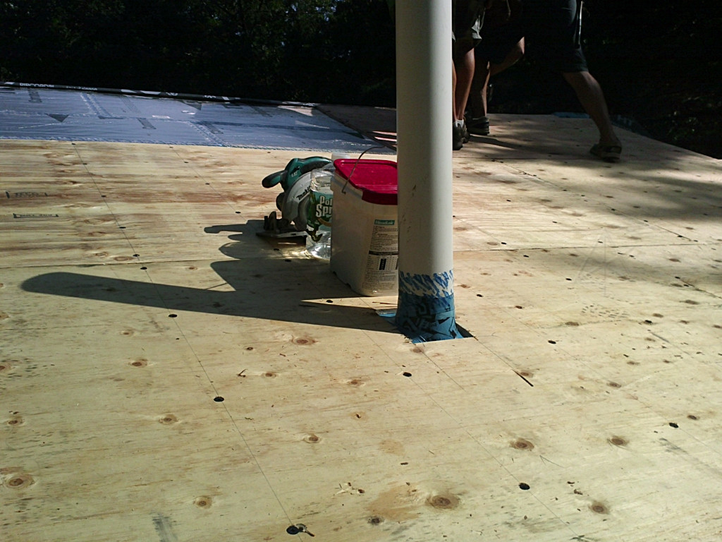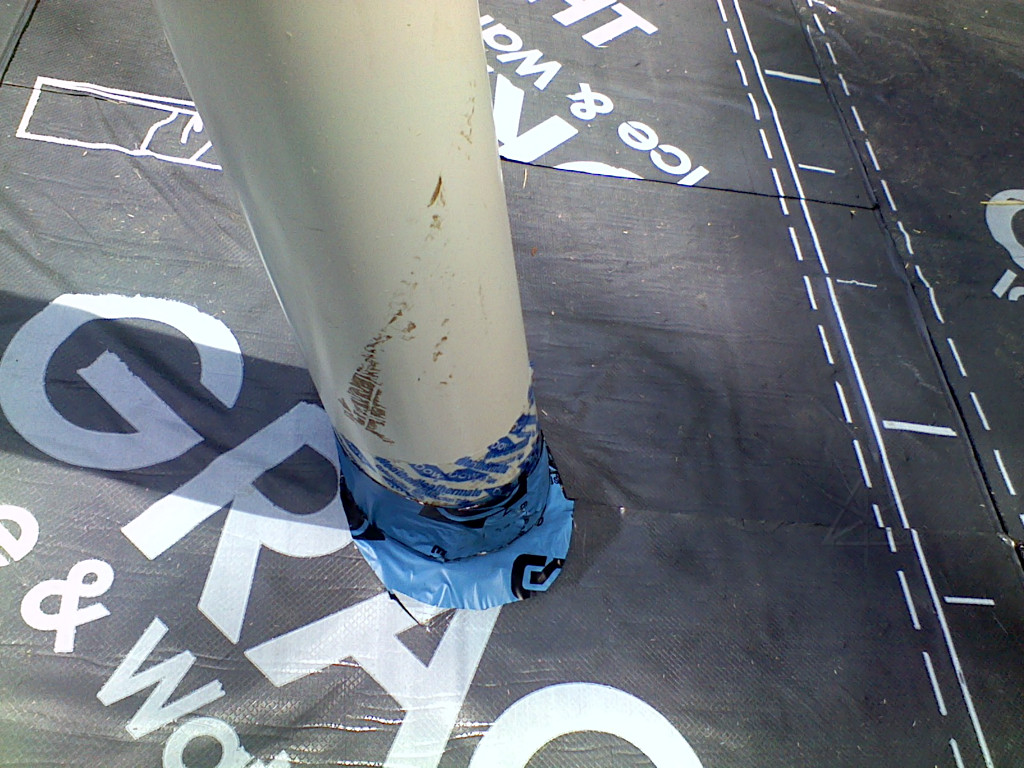 Once the ply was down, *more* flashing went on around the pipe as the Grace was rolled out across the completed over-deck. |