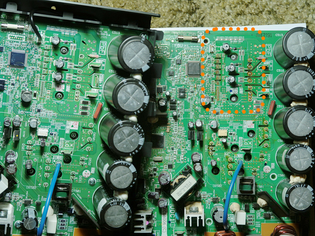 | We can't see it here, but there's a largish finned heatsink sticking out the back side of the board assembly, that sits in the airflow from the main fan. No power devices are visible on the top side of the board, but it is pretty clear from the large lands and isolation gaps where they are soldered in from the flip side. |