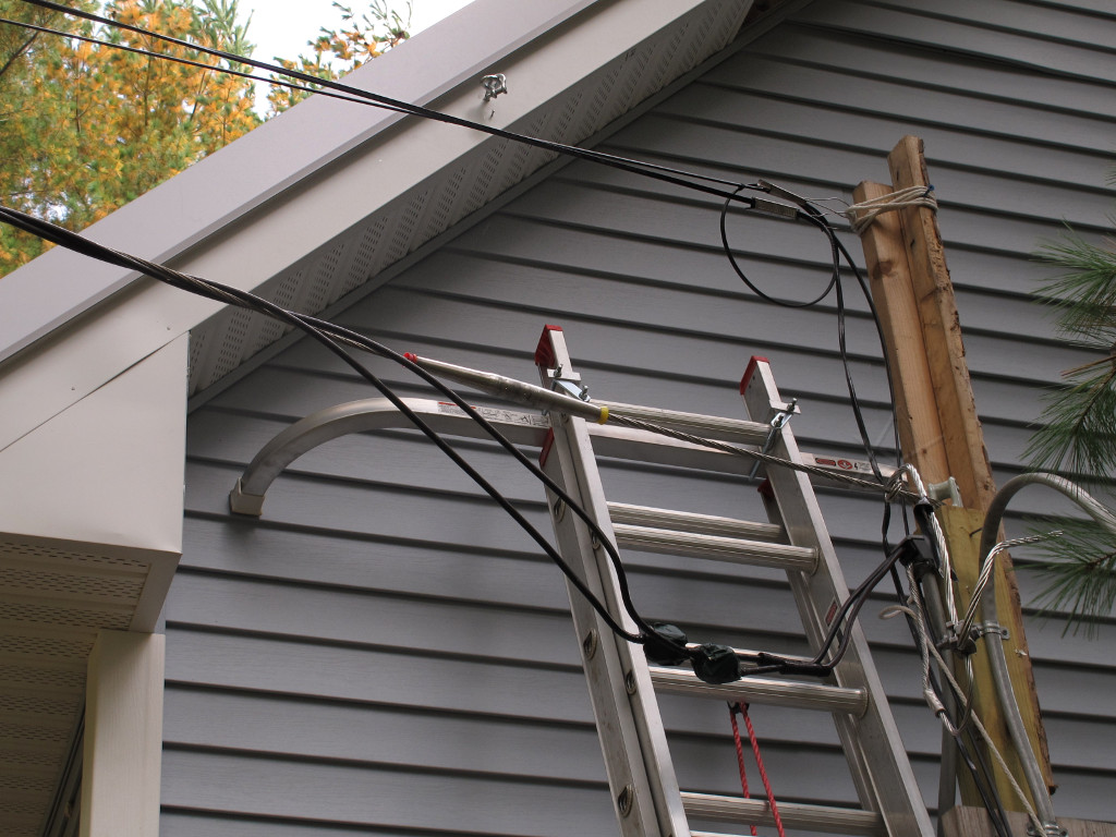 A ladders' eye view of the installation, before everything was buttoned down. Both here on the back and in the front it turned out that the roof panels were going to deliver water just about perfectly into the gutters. Here on the shed the panel line continued to just barely above the lip of the gutter, which might make eventual snow shedding easier; the angle was steeper on the front but that was fine as water might be rolling a little faster down the front and it would zip right into the middle of that gutter. |