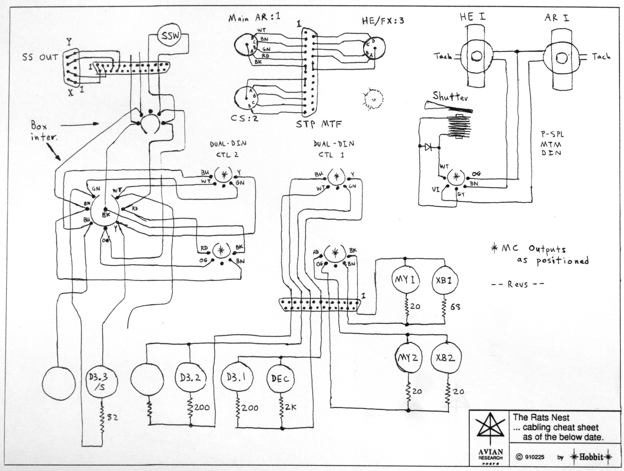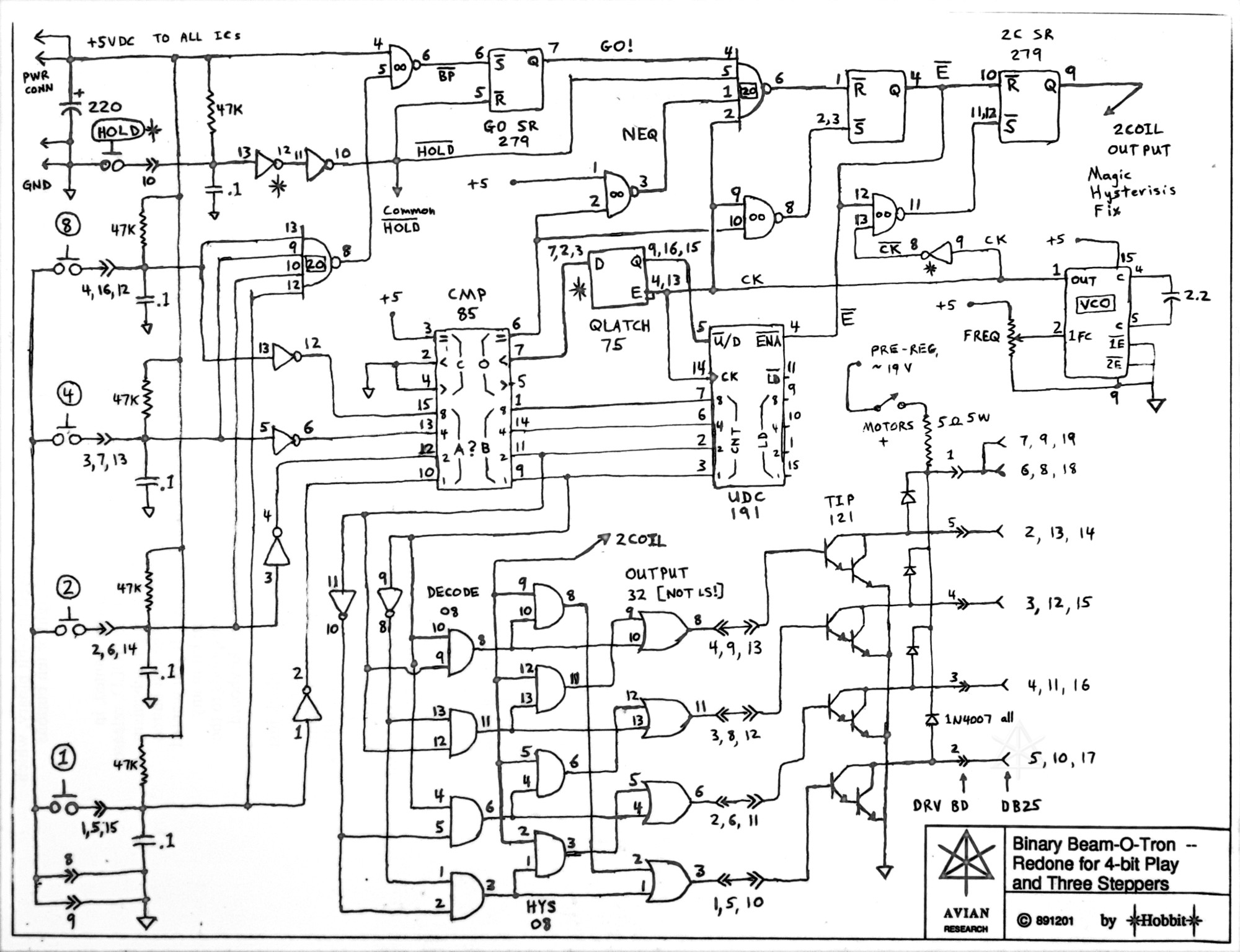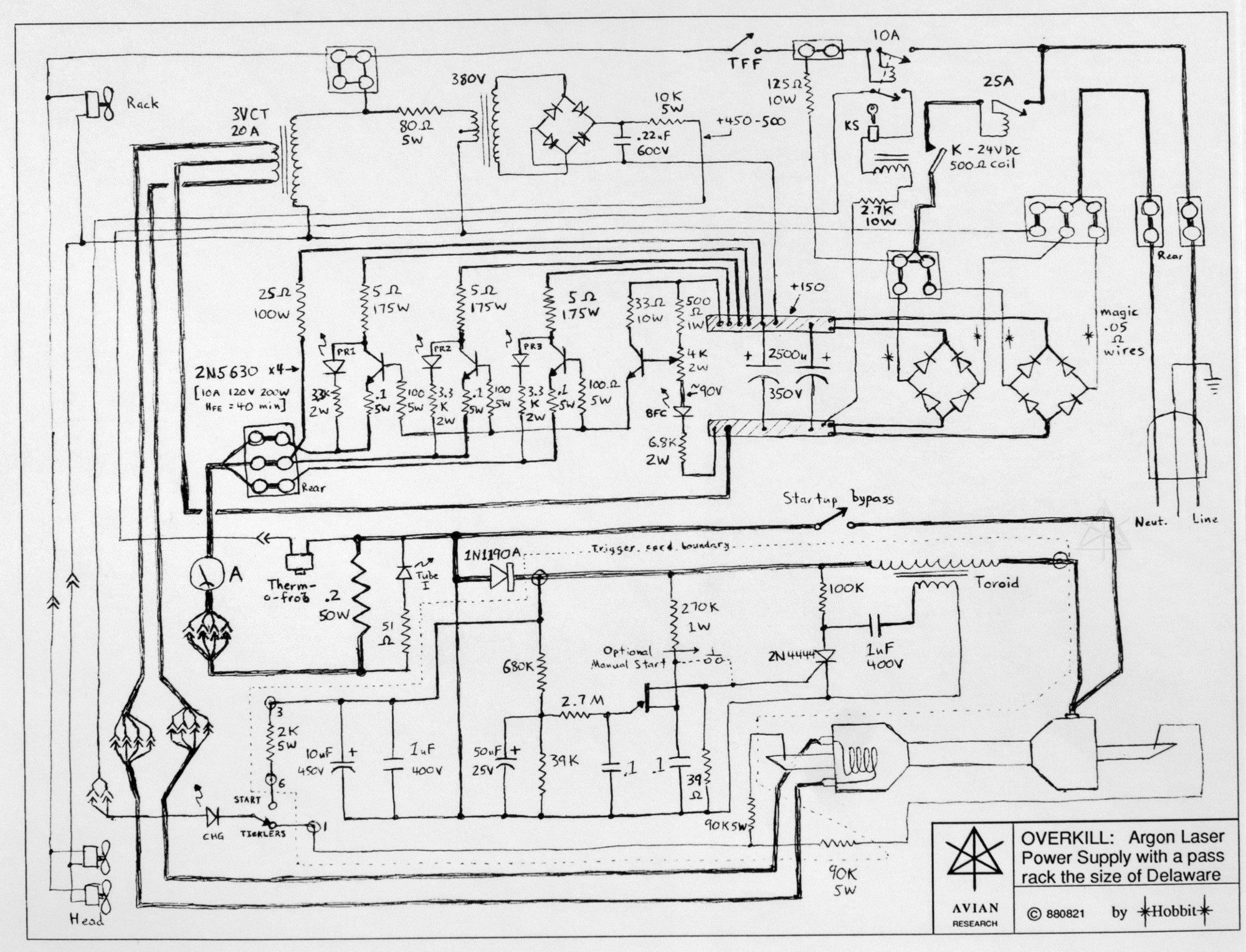 It was fun, and in part sort of a friendly competition among friends who only saw each other at East Coast science fiction conventions. We would slave away on this stuff in between, with the idea to always try to bring some new toy or level of advancement to the next convention. Kept us off the streets, I suppose, except of course when hamfests and techie flea markets came along, when we'd go shopping for the support materials we needed. All of us were (and still are to some extent!) skillful trashpickers as well. There are relatively few records from that time, since we did not yet have the ubiquitous internet and handy digital recording capability. We were actually all on the network already, before dot-com or dot-anything even became reality, so we could exchange email and ideas. But the idea of shooting a "looky at this cool thing I threw together!" video and hanging it out on Youtube or something wasn't even on our radar yet. [Someday I may try to unearth what few old photos I can find of this.] However, I did try to document my own work fairly carefully, if for nothing else than to have clear references in case *I* needed to dive back in and fix some piece of my gear. For that as well as being able to geek out over engineering points with people at the events we attended, I worked up nice neat schematics for my electronics pieces after the designs were more or less finalized. I recently dug some of these out of long-archived piles of notes and worksheets, and decided to digitize them for some dubious posterity. The title boxes and sheet frames were originally printed by simple Postscript routines, but all of the drawing was by hand. A close look may be able to detect minor artifacts from areas that received white-out where I made small mistakes, but I managed to get rid of most of it in the process of cleaning up all the document-cam photos here. The lasers generally available on the hobbyist market at the time were the standard red helium-neon types, at typical outputs from 1 to 5 milliwatts. They were okay, but sort of stuck in a rut as far as color variety. One clear pride-and-joy bit of my kit was a salvaged argon laser from an early high-volume laser printer, which produced a beautiful blue beam at quite a bit more power, and could even split into a few different lines of color under some circumstances. I only had the tube head, and it took a while to work up a suitable power supply via sketchy specs I managed to worm out of a support guy at the company that originally made it. One of the most memorable days of my life was when I got that thing to fire for the first time. I was just agog, staring at an incredible cyan dot on the wall. "Blue sex!" I triumphantly emailed my colleagues, and that tube along with other tubes that had started hitting surplus markets took our informal shows to a new level. My first power supply was super-primitive, using an alligator clip to move between points on a resistor bank, and I had to hand-trigger the tube with a piezoelectric sparker to start it up. I wanted something more robust, less of a fire and electrical hazard, and with variable output, so the end result was this.  |