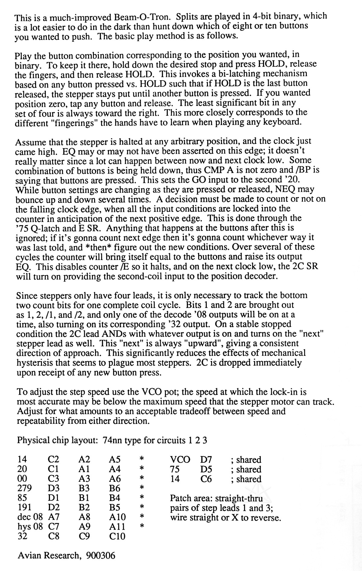 The modern design methodology of running everything with a processor and writing the necessary code was still less common, so my first beam-switching project was done in raw TTL on a beautiful socketed and wire-wound board I found inside some old IBM controller or something. Beam-switching is what we would often see at concerts and such -- brilliant shafts of pure-color light leaping out over an audience through the fog, and they'd swap crazily back and forth in time to music (or not). The easiest way to do this was to use a mirror to swing a beam across a handful of other adjustable mirrors, which would be aimed off in different directions across a space. This is hard to do accurately by hand, especially when you're trying to have that exiting beam hit *another* mirror across a room -- alignment is critical. So the idea was to have something completely repeatable, i.e. when commanded to redirect-mirror number 3 it would always lock in the same position and reliably "spiderweb" a room through one or two more strategically mounted catch mirrors. Stepper motors were an obvious choice, with a wealth of same to be found in old floppy drives and printers and such. These must be driven in a particular way to move in the right direction and stop on a particular step, so electronic control is necessary. The box I came up with, through two or three revisions, I named the Beam-O-Tron. With a remote keyboard I could sit back across a room from my toys and have my small but very satisfactory analogue of that mega-concert look.  |