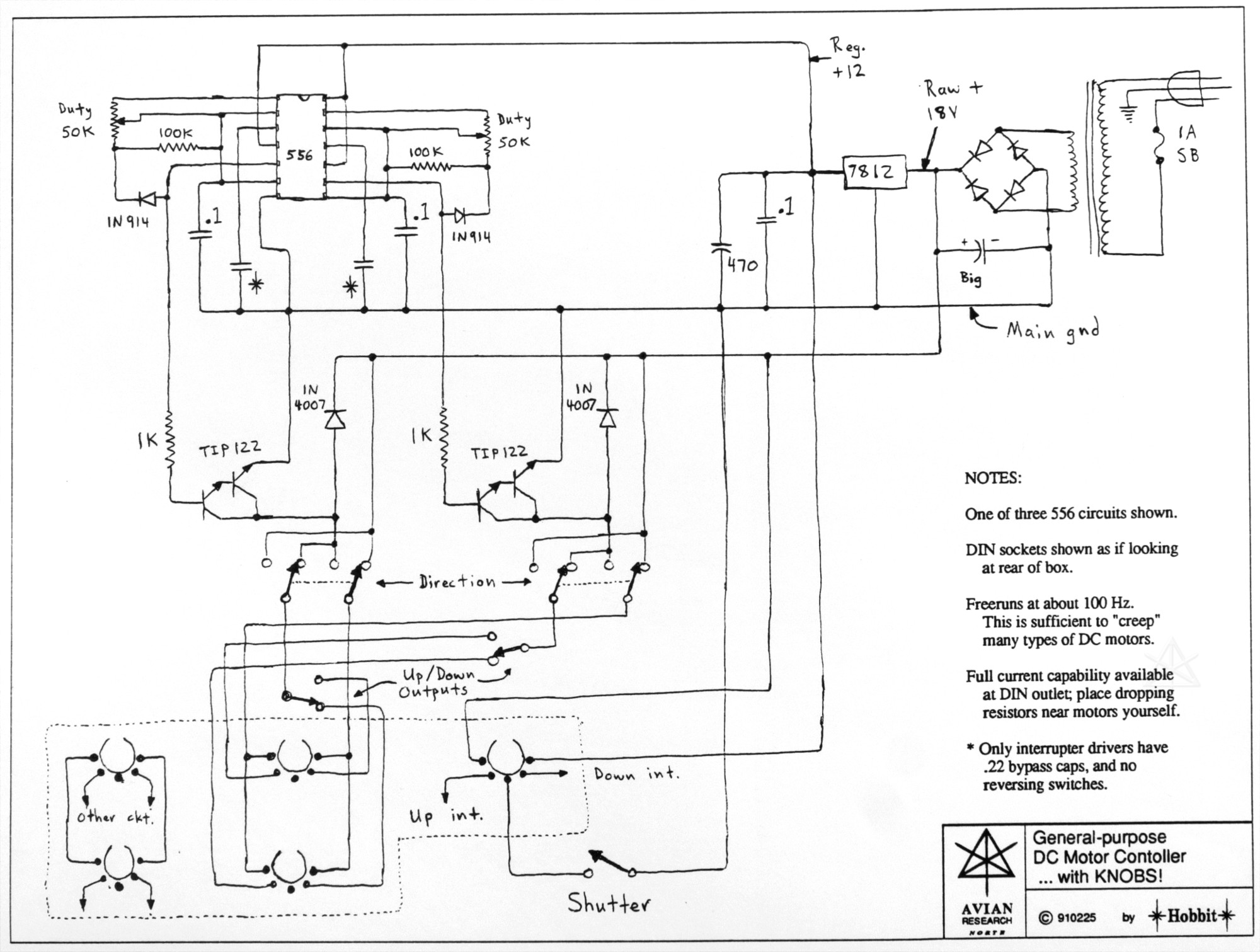 Even though my gear eventually evolved past the "spirograph" point and graduated to a coveted pair of galvanometers, I still needed a general-purpose motor controller for everything else. Here was an early example of applied switched-mode technology -- a typical DC motor responds quite well when driven in a pulse-width modulated way, and the circuitry to do that is fairly simple. Using a particular range of switching frequency also helps motors be far more controllable during low-speed "creep" -- which was exactly what was needed for certain types of effects. Some optical elements were mounted on gear-motors and would always turn slowly, but some others wanted to be driven over a wider range of speeds and this controller was perfect for both jobs.  |