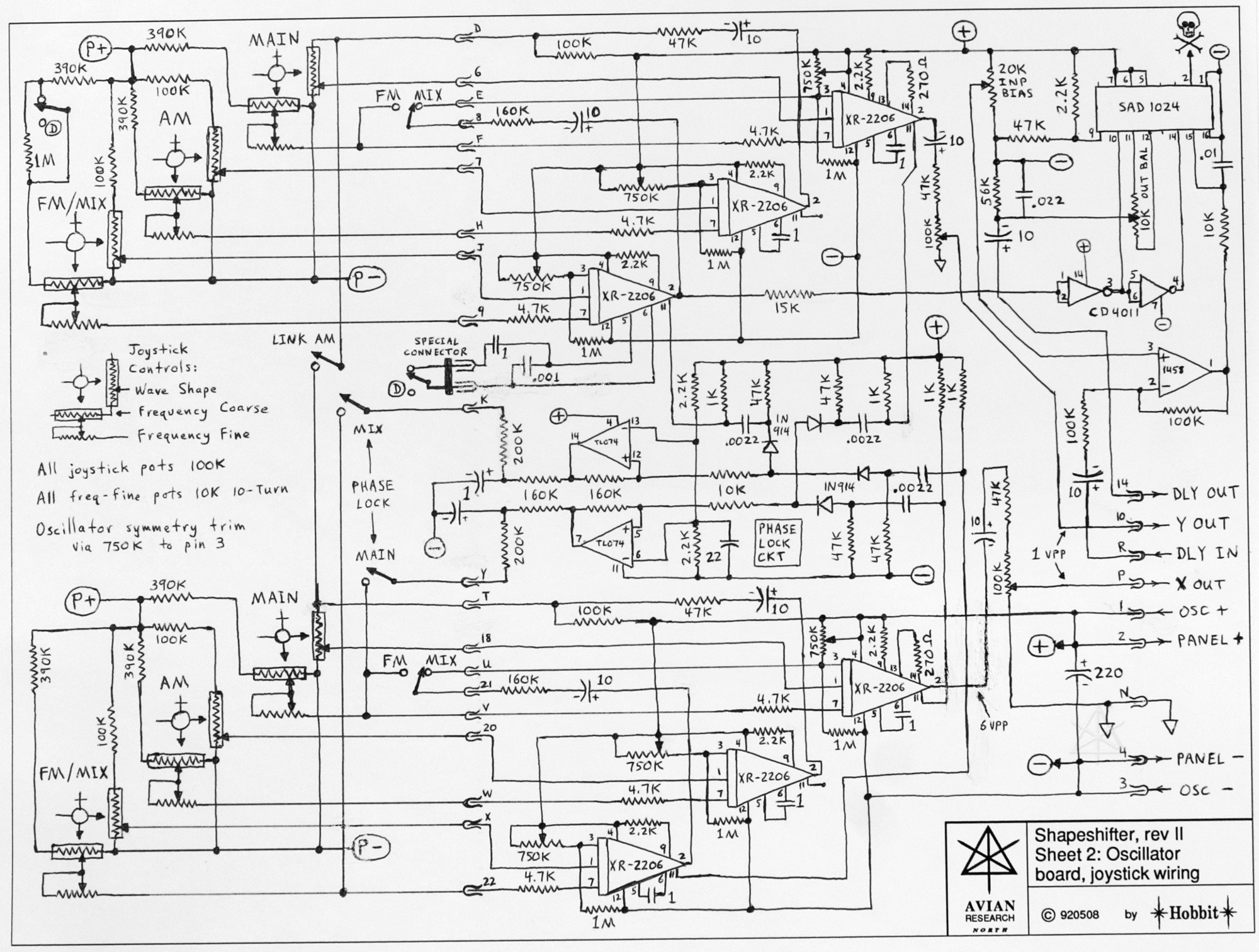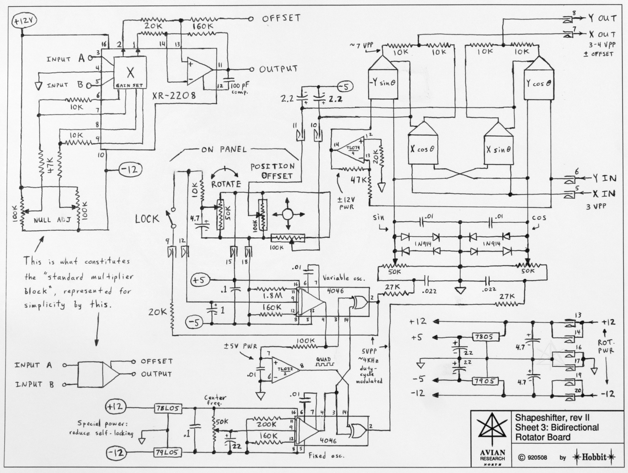The professional-level galvanometers used in commercial shows were generally tiny and very fast, with highly custom driver circuits, and *stupidly* expensive. I settled for a bigger, slower pair but those were quite capable nonetheless, up to about 200 Hz. Our brains stop interpreting flicker at about 30 Hz, so they were fine for my purpose and more importantly I could afford them. My approach to suitable signals was purely analog, at the time not tackling the computer-driven type of thing that was evolving in the professional shows. [And ultimately, I never went that route, although one of my colleagues did later on and did quite a nice job in that area.] In fact, for a long time the system at our local planetarium was still primarily analog with only a few specific figures "drawn" from signals played off tape once in a while -- no local computer generation, that was done at the company mothership and sent out to show locations. Our group had an incredibly fortunate opportunity to sit down and chat in technical depth with the guy who ran those planetarium shows, who was also quite the engineer himself and had added some fun features to their system. From that nerd-fest emerged several enhancements to my own signal-generator box, which I dubbed the Shapeshifter. This was built into a big old aluminum case for some kind of "high speed" data modem whose days were long over; it already contained a beefy power supply and a big beautiful flat sheet-aluminum upper surface that I was free to drill mounting holes in to my heart's content. Joysticks and knobs were used to control the base electronics, which I commonly referred to as "six oscillators all buttfucking each other". The basic output was a huge variety of Lissajous patterns, as one would expect from variable signals in X and Y. Later, circuitry got added to delay one axis into the other in creative ways and lo and behold, I had a rough equivalent to a "spirograph" generator again that was more stable and easier to control. Horowitz and Hill taught me about phase-locking, and from that came a simple circuit to gently lock the two running axes together in any relative harmonic, to yield figures that *didn't* keep precessing by themselves. But the crowning feature, an idea that fell out of the Planetarium Pow-wow, was the rotator board -- a feature to take any figure currently being drawn and simply spin it around the center using a sine/cosine transform. This, as I'd seen in some of the Planetarium shows, opened up even more worlds of movement.  |