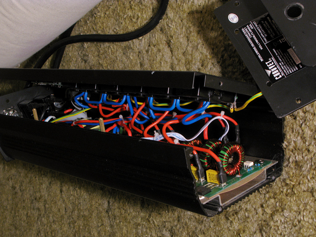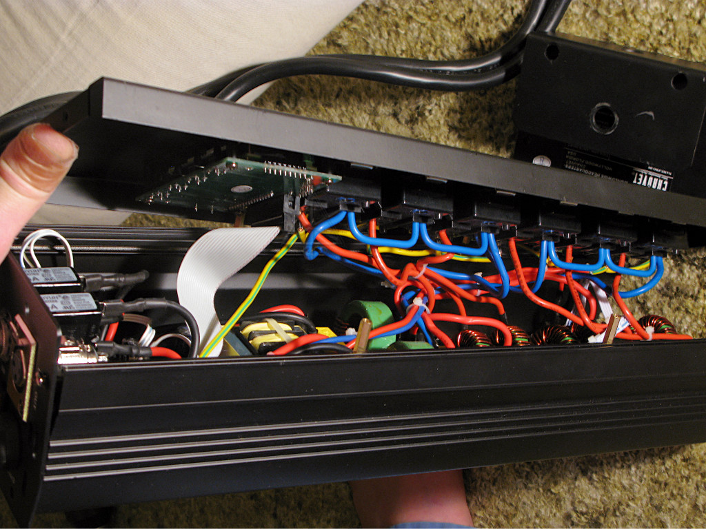 It's the typical dual-input-plug design, which splits two 20A feeds to three dimmer outputs each. There's a smallish toroid inductor on each output and a bit of token filtering on the inputs, all told probably just enough to take off the really sharp harmonics but not really suppress noise. The input cordsets are 12/3 SJTW with *very* stiff insulation, typical of many Chinese power cords these days. The molded plugs are 20 amp 5-20P type with the sideways neutral blade, sometimes making it a little harder to figure out where to plug them in. The ironic thing about most 15A vs. 20A Edison outlets is that the internal brass is by and large exactly the same, the faceplate just has the "tee" slot in the neutral hole or not. The pack is not really designed to be serviceable, and is in fact hard to gain reasonable access inside because all the wiring is crammed in and closely bound up with zip-ties. I've got it pushed apart about as far as I dare in the lefthand shot. When the outlet panel is in place on the extruded housing, the wiring is all mashed together and it's actually hard to fully seat the panel. Close examination [click each pic for a larger version] shows a few places where the insulation has been pinched and nicked by the surrounding parts. There's a fair bit of empty space near the ends of the unit, and it would have been easy to use a little more wire and make a nice service-loop out of the six output leads, four neutrals and a ground to allow the panel to swing conveniently away. This also shows a poor choice for output receptacles, using the "back-stab" type of spring-lock connection into the sockets instead of solid lugs and screws. Ask any electrician about the long-term viability of such back-connect duplex outlets, especially under sustained high loads. The present-day answer is to avoid them like the plague. At least the neutrals are doubled up and run to either end of the chain across the outlets, to avoid loading any one connection too hard. Is that all solid-core wire in there? It's quite stiff but I couldn't really tell, and didn't want to tug on any of it too hard. At this point, I gave up and put the thing back together. But what was the original observed problem? When trying to bring lights up slowly, anything connected to the second half of the pack in channels 4 - 6 would not come up smoothly, but suddenly pop on somewhere over halfway as soon as any nonzero level command was sent via DMX. The same thing would happen when the pack's control panel was used to set a manual level -- as soon as anything above 0% was requested, the high channels would be a-burnin' brightly away while the low ones would just barely begin to warm the filaments. Later, however, I couldn't reproduce this at home with the two power inputs plugged into the same circuit, or even two different circuits on different legs of the house panel. At that point it began to dawn on me what was going on, and a quick dig into the PDF manual for the unit revealed that it's a documented issue: