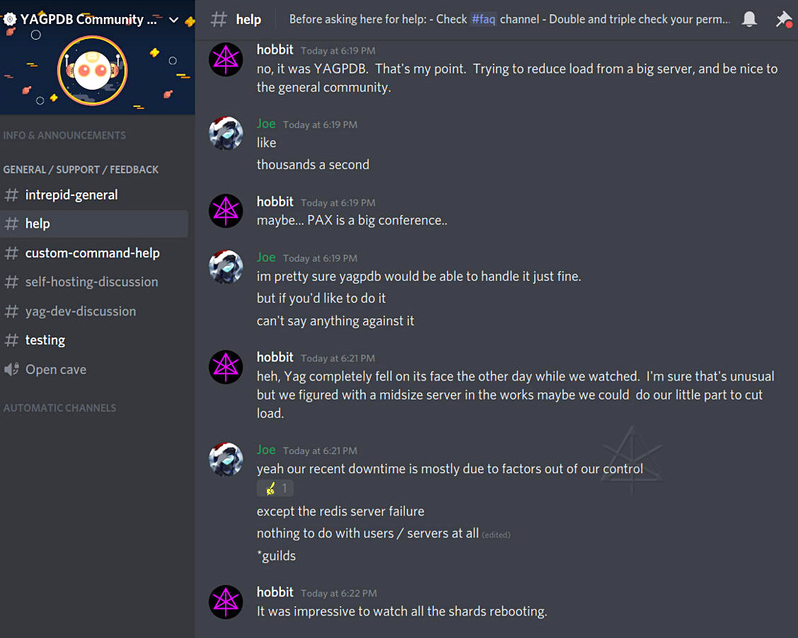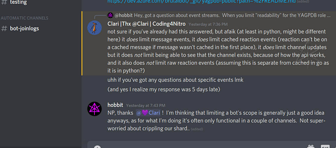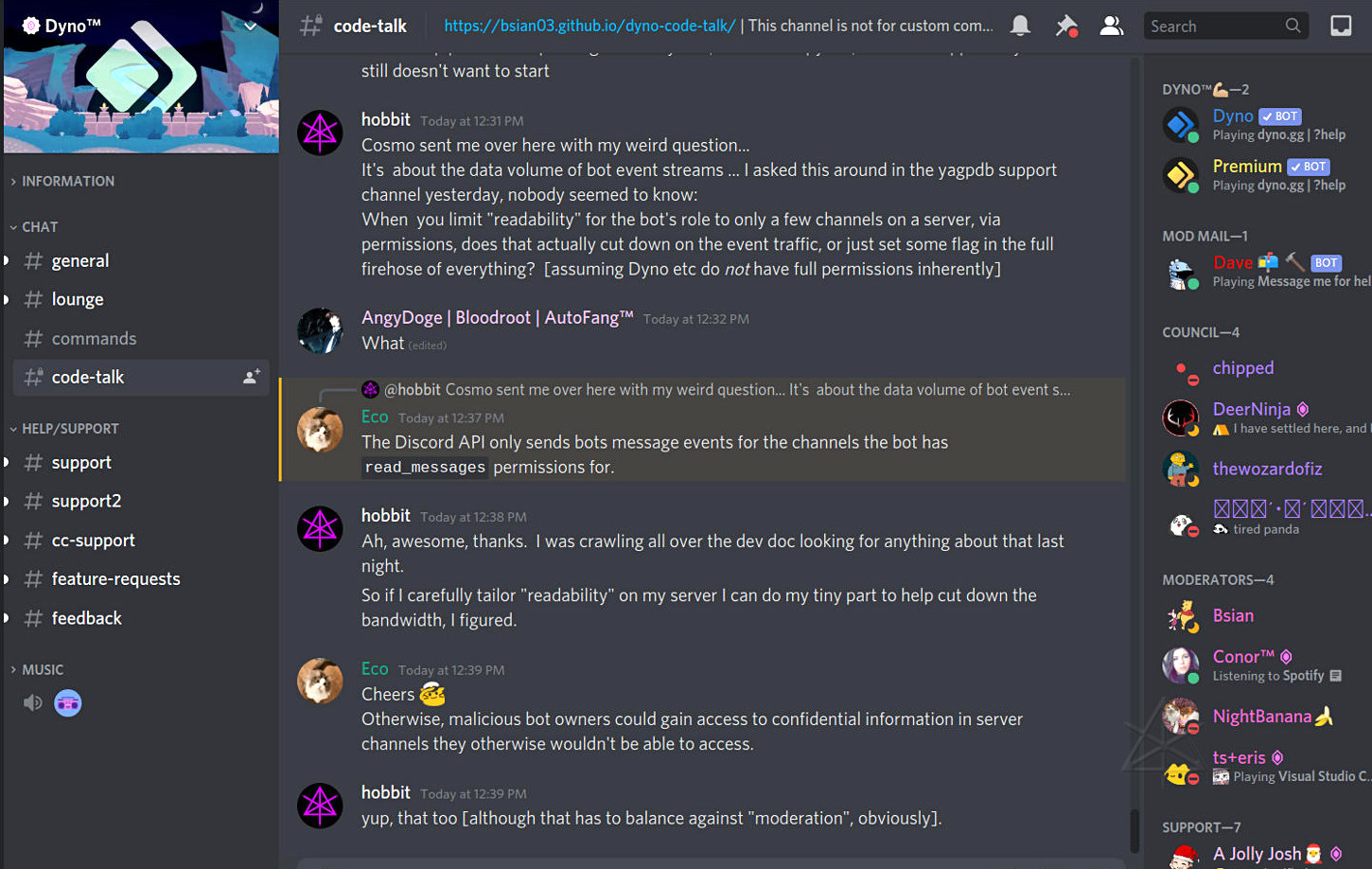 | Discord bots connect to Discord's infrastructure at an intimate API level, and once enabled into a given "guild" or server, begin receiving a massive stream of events. These can be anything from ordinary channel messages to any administrative changes, arrival and departure of users, rearrangement of channels and roles and permissions, connect and disconnect to audio/video channels, etc. In most setups, the "bot sees all" because it's often serving to auto-moderate conversation traffic, but now I was curious whether Discord's infrastructure would honor its own permission structure and withhold events that a bot's permissions would prevent it [as a "user"] from receiving. In other words: would disallowing a bot's purview of most channel traffic physically limit the number of "regular" events being transmitted? Most bots have their own support servers, so I went off to those to try and find out. |