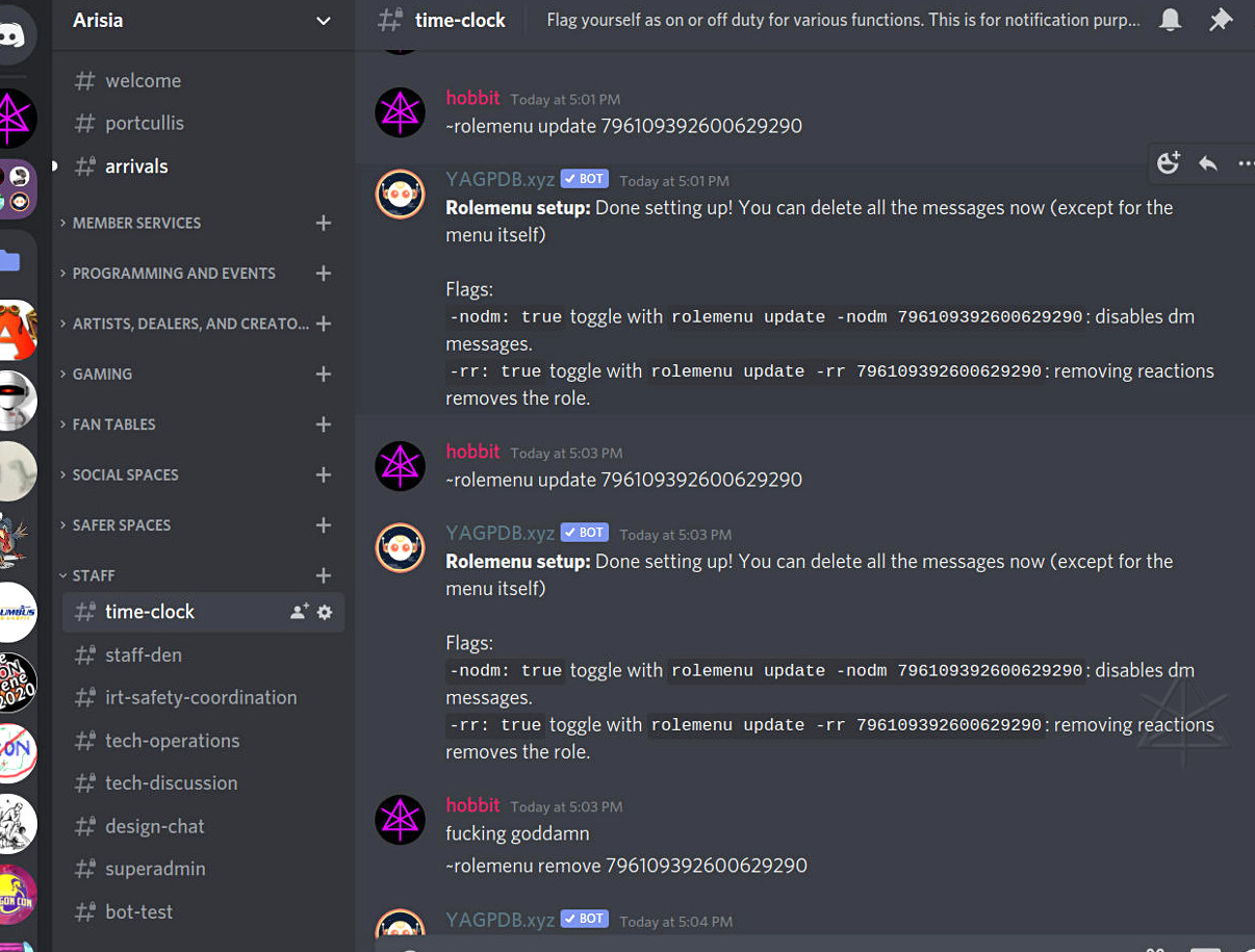 This is what the final role-command group configuration looked like at the YAGPDB end. The YAGPDB doc on role-menus lays out how to set this up fairly well, although it's a little sketchy on how the "edit" function is supposed to work. That's one reason reworking a menu is a pain in the ass unless all you're doing is *adding* to it. |