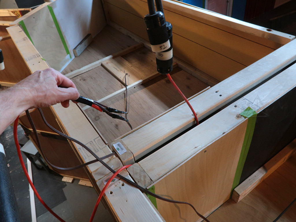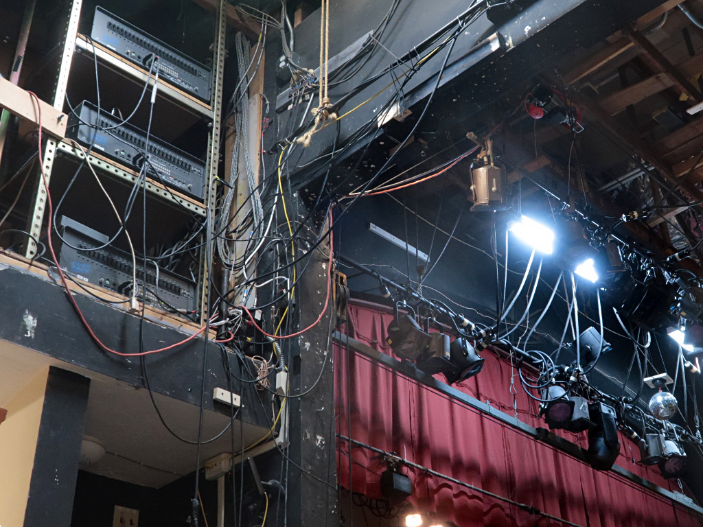 The shop becomes part of the backstage for show runs; these props tables hinge down to sit flat when needed, and are otherwise fastened up out of the way. |