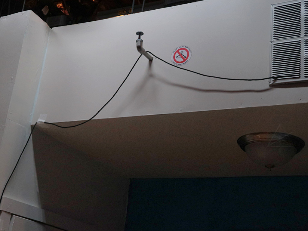 At one point during the play there's a stray gunshot, and the original idea was to have a special lamp practical motorized to spin its shade around and expose a big bullet hole to the audience while the cast stares at "where that shot went". A very clever idea, but unfortunately it wasn't going to work out the way it was originally intended.  | |