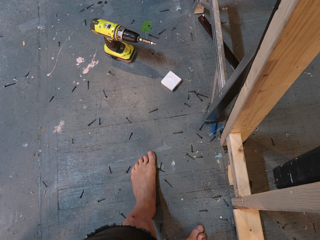And given all the rough stuff I'd been walking on over the last year-plus, I saw no point in having footwear for any of this. I realize that most people would view this as somewhere between heroic and utterly nuts, but really, drywall screws lying on a deck are on their sides, and the threads and little bugle-heads don't stick up enough to be a notable problem for a seasoned barefooter -- in fact it all feels rather entertaining to walk on. Stiff shoes are in fact more likely to roll out from under someone on these, where bare soles just mold to the shapes as needed and maintain secure floor grip. I am always more likely to tear up my hands on this kind of work than my feet, but I didn't have work gloves on either and only a couple of folks on the crew bothered with those. |