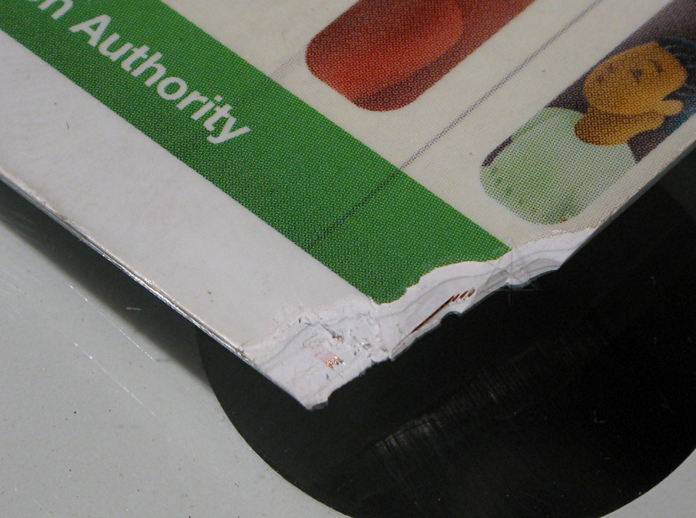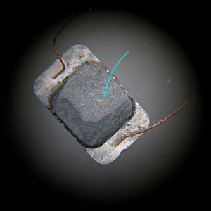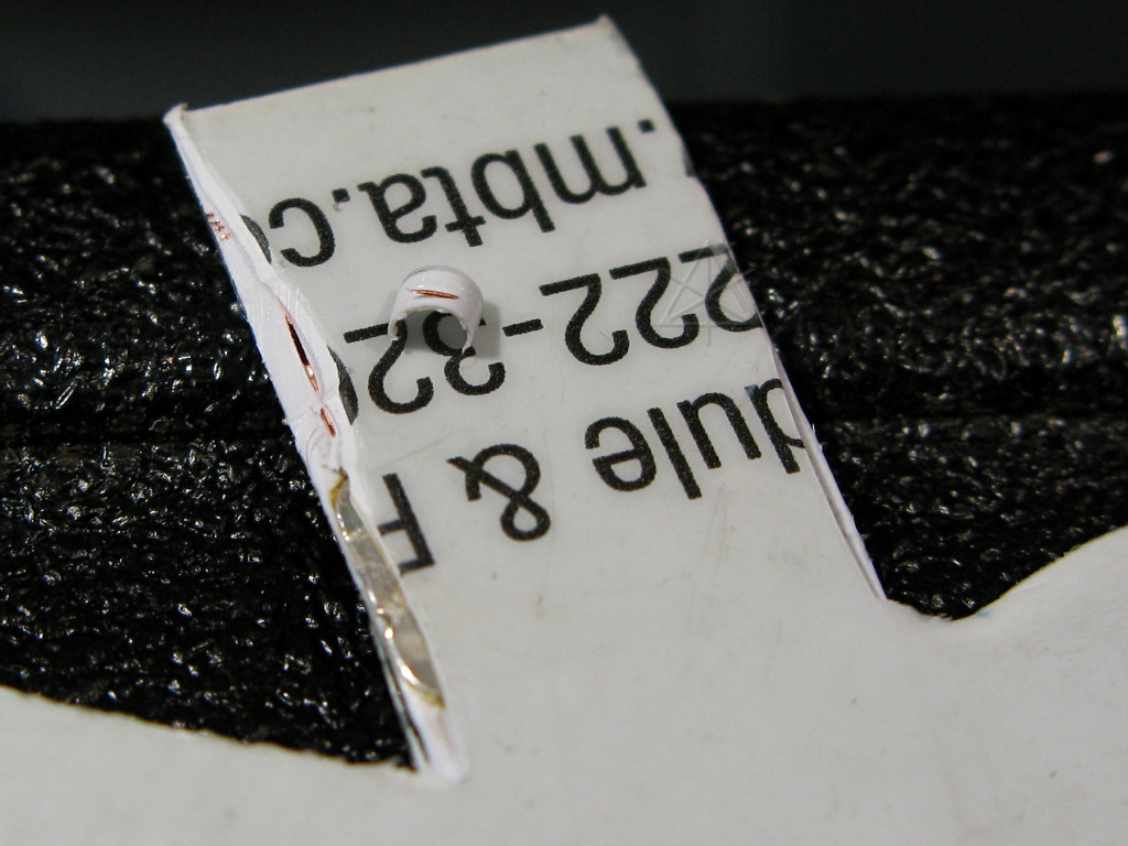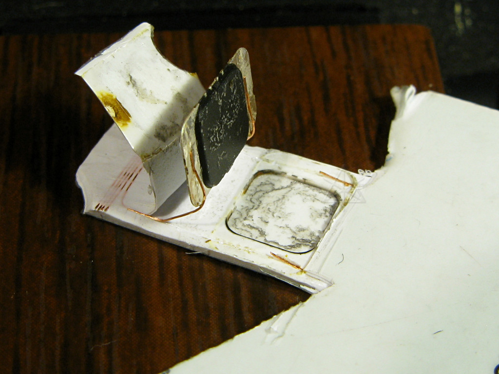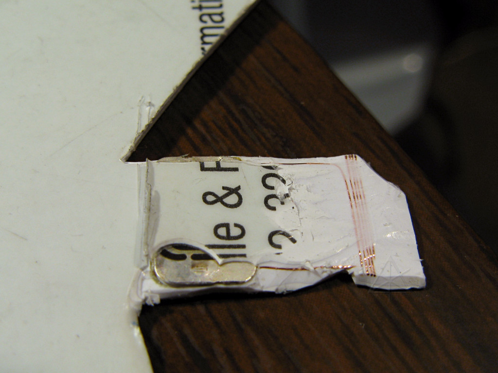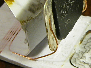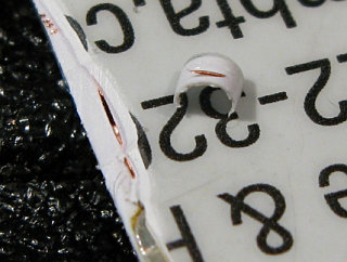 | Shaving off one corner shows the plastic layering, and how the coil wires run through the mid-layer. |