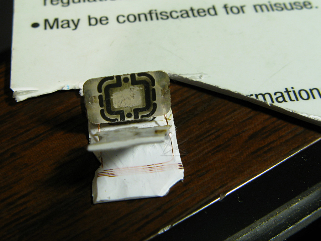 | A strong light behind the area and through the plastic clearly shows the shape of the chip inside, and the coil wires leading up to it. |