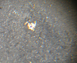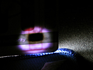 | When the card is lit from just the right angle, a small region becomes evident with two slightly dipped shapes on either side. This is where the embedded chip sits. |