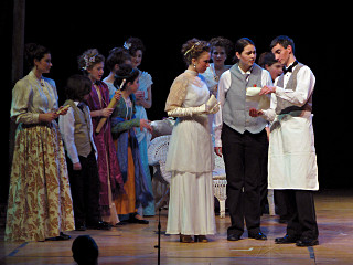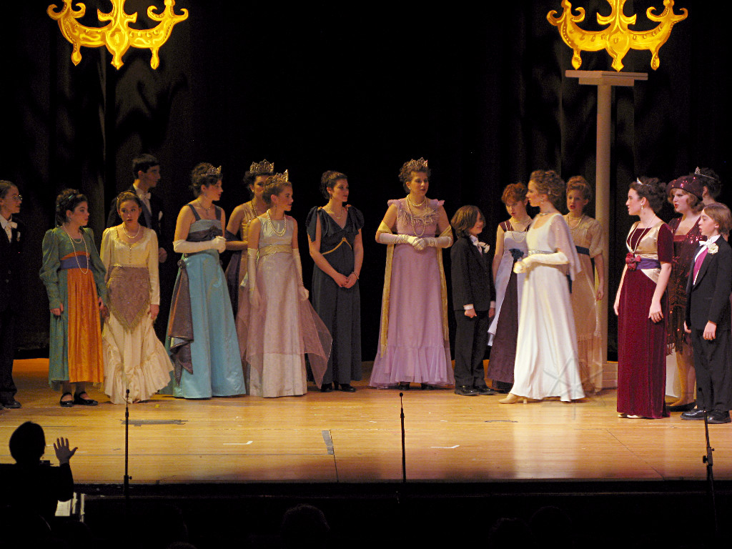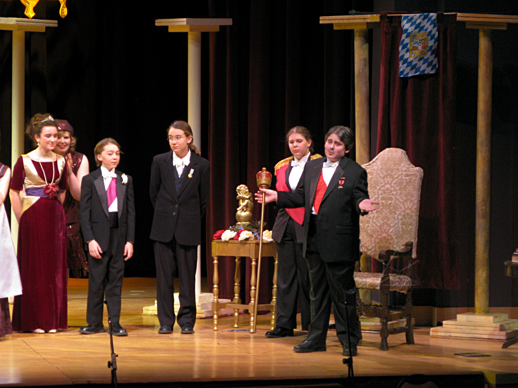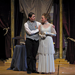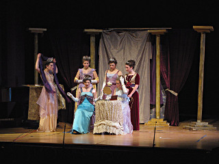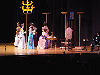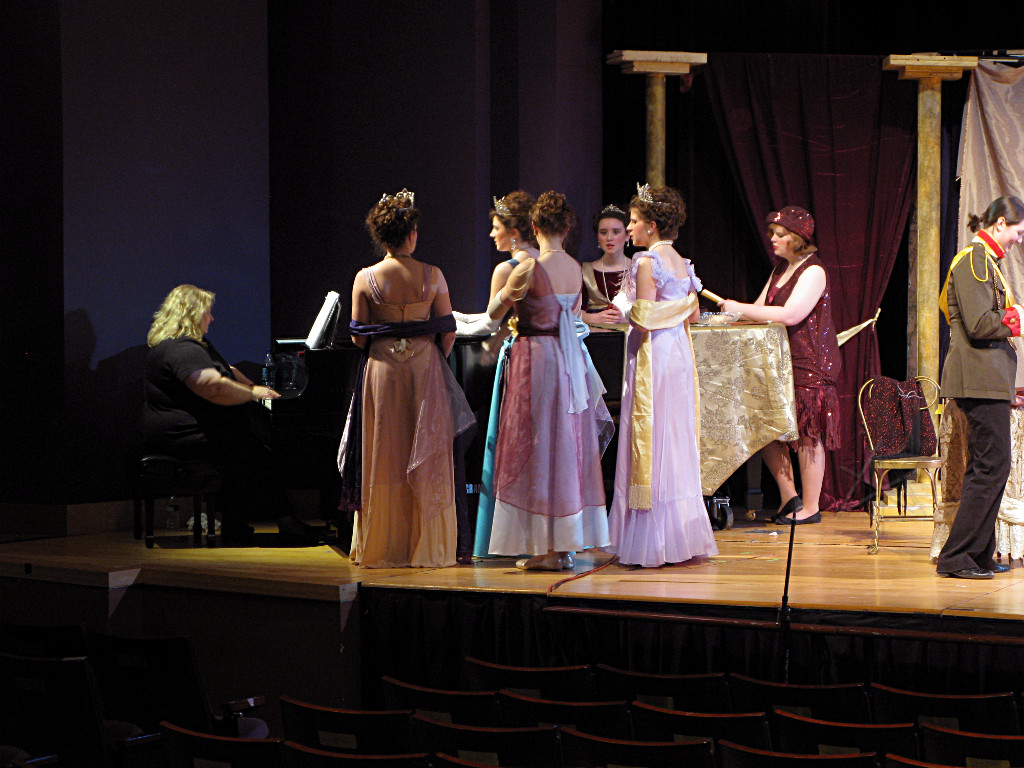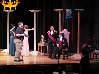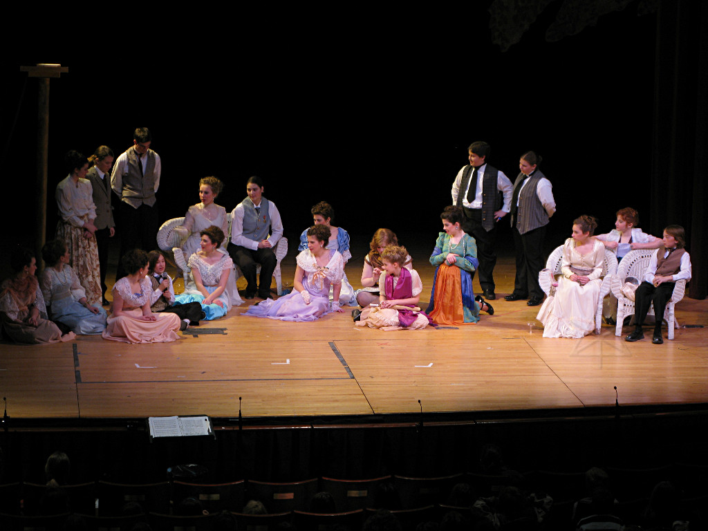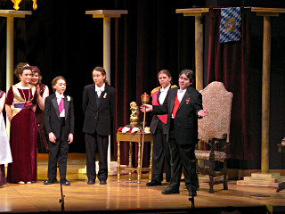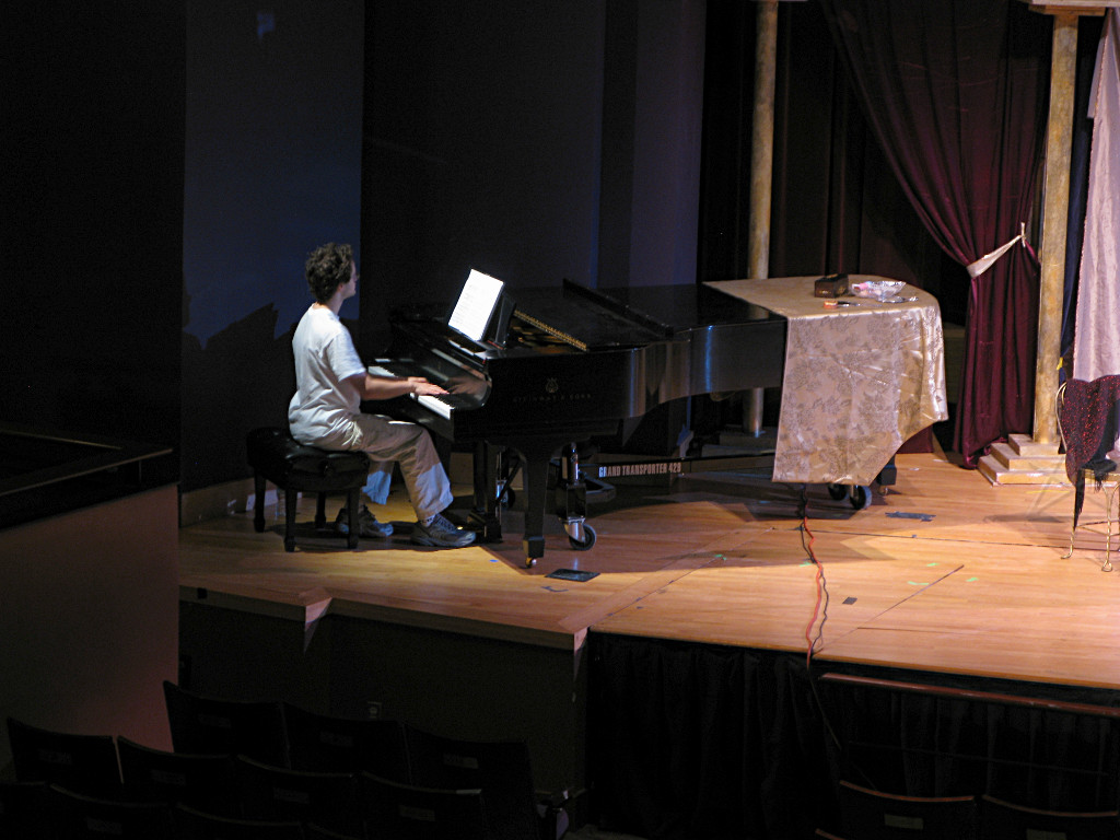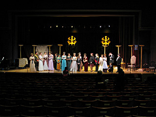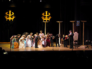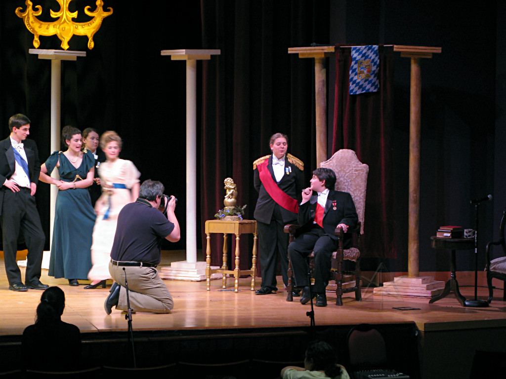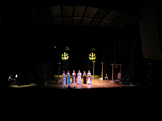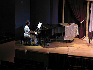 The camera's perception of the dynamic range difference is even more profound, and I had to do a lot of post-fixup in the photos to bring people out of the darkness in the back so we can see them here at all. That's why the background people look a little flat and grey sometimes -- I was desperately trying to pull a little detail out of very photographically dark regions, and there's only so much one can do and not have it look totally awful. But shooting any brighter [e.g. slower] would have not only bloomed the fore-people into white blobs, it would have let in a lot more motion blur, so staying on the dark side was deliberate. Setting a manual white-balance calibration was essential for getting the captured colors even close to right. Regular "tungsten" mode would have drifted way too far toward the pink, given the LD's gel selections, so I'm glad I went up on stage with a piece of paper to give the camera a more accurate notion of our spectrum. Even then a touch of "de-greening" was necessary here and there. Our eyes and brains adapt, but a digital camera is often very unforgiving. I will also note that my own knowledge of the story details gets pretty hazy past this point, so the commentary is kept deliberately sketchy and relies mostly on the program notes. Really, the point here is to just have the pictures available online.  |