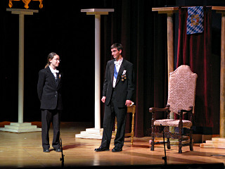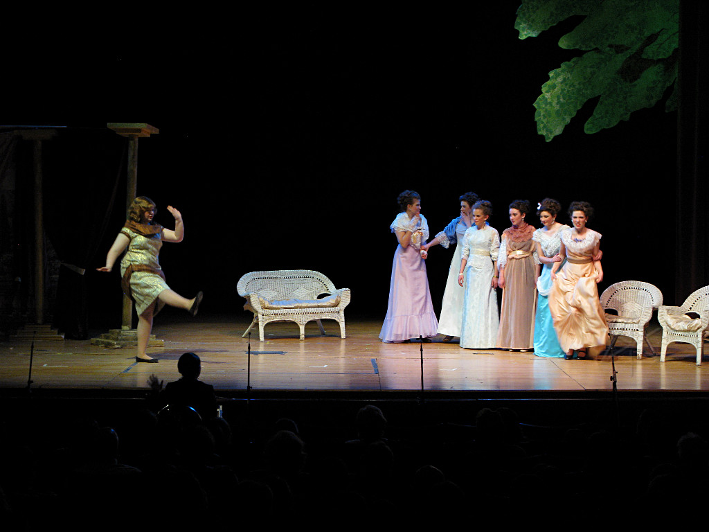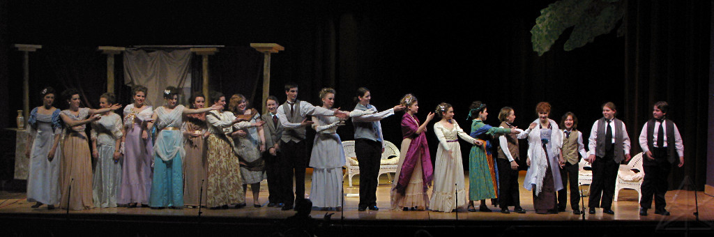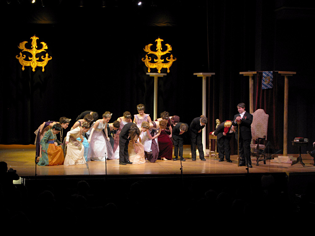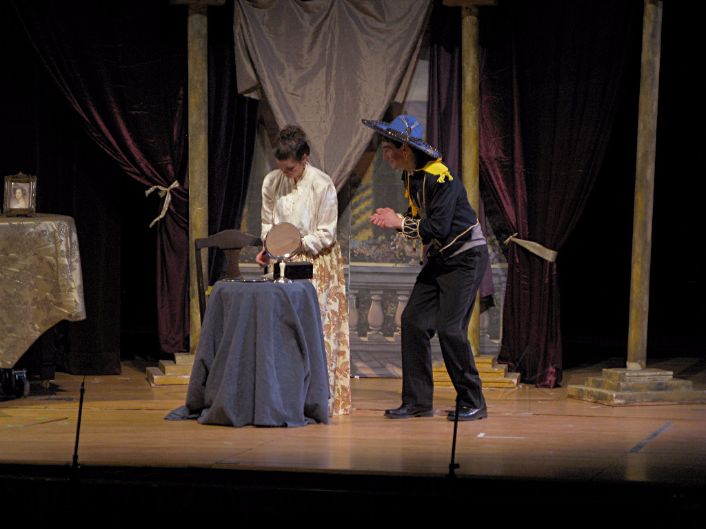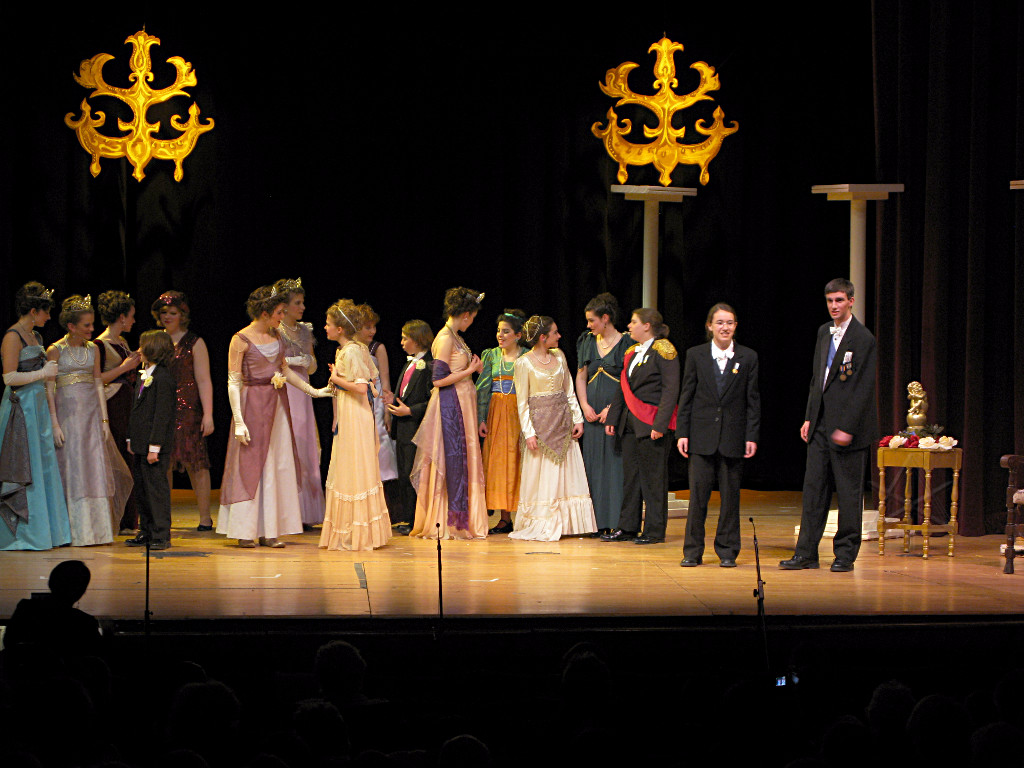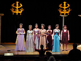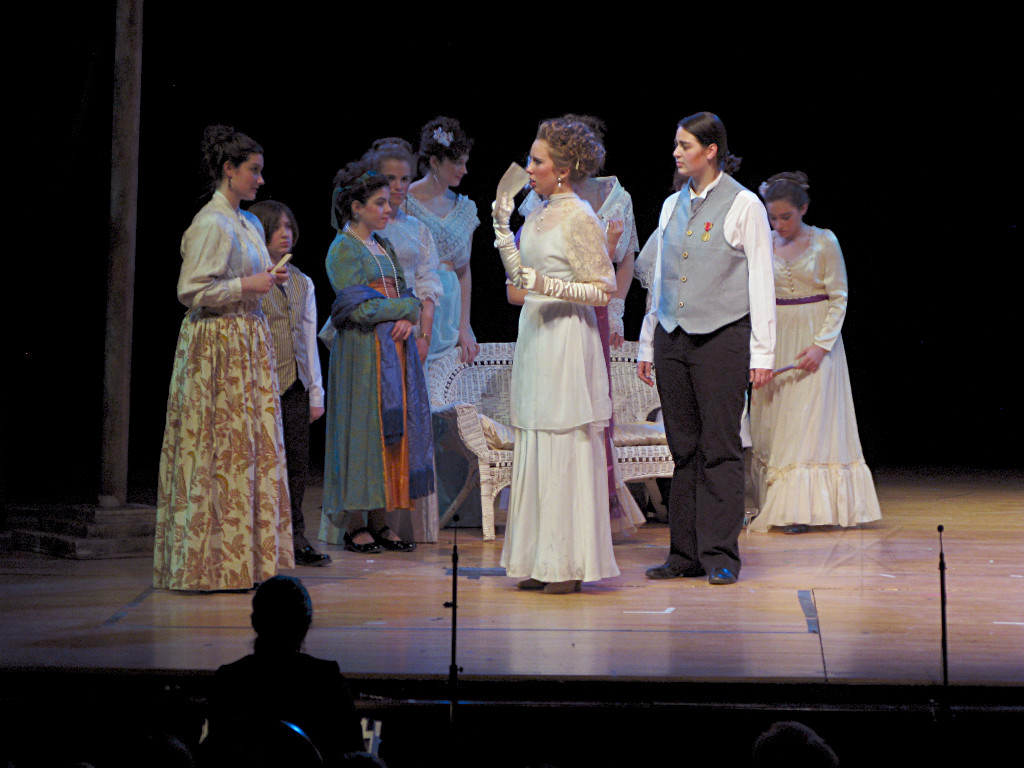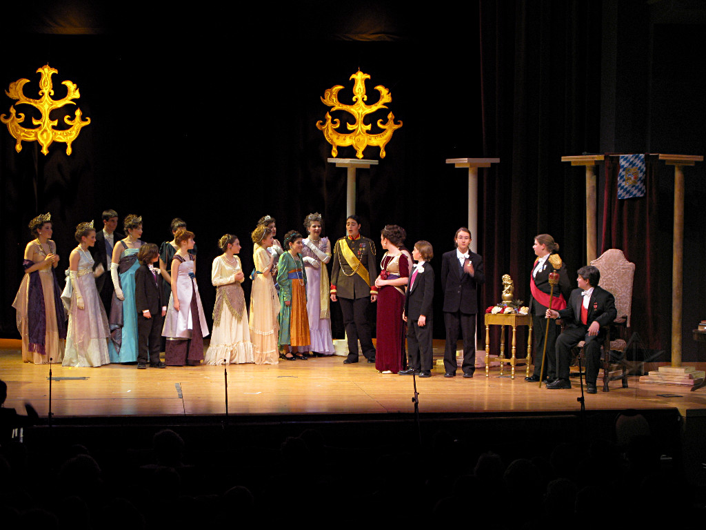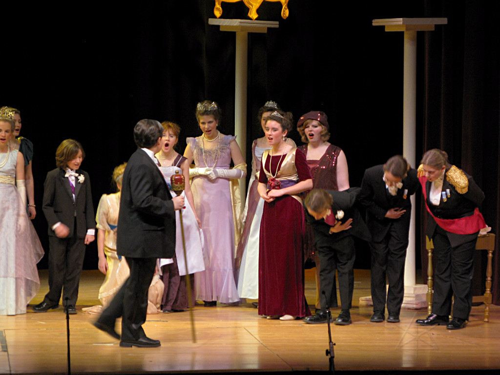 The camera's perception of the dynamic range difference is even more profound, and I had to do a lot of post-fixup in the photos to bring people out of the darkness in the back so we can see them here at all. That's why the background people look a little flat and grey sometimes -- I was desperately trying to pull a little detail out of very photographically dark regions, and there's only so much one can do and not have it look totally awful. But shooting any brighter [e.g. slower] would have not only bloomed the fore-people into white blobs, it would have let in a lot more motion blur, so staying on the dark side was deliberate. Setting a manual white-balance calibration was essential for getting the captured colors even close to right. Regular "tungsten" mode would have drifted way too far toward the pink, given the LD's gel selections, so I'm glad I went up on stage with a piece of paper to give the camera a more accurate notion of our spectrum. Even then a touch of "de-greening" was necessary here and there. Our eyes and brains adapt, but a digital camera is often very unforgiving. I will also note that my own knowledge of the story details gets pretty hazy past this point, so the commentary is kept deliberately sketchy and relies mostly on the program notes. Really, the point here is to just have the pictures available online.  |