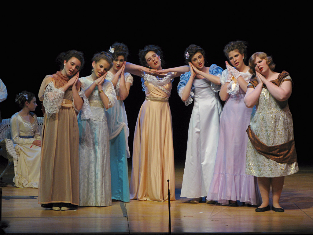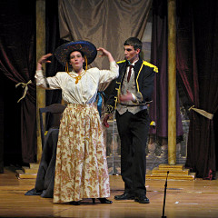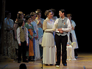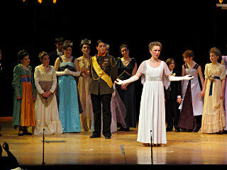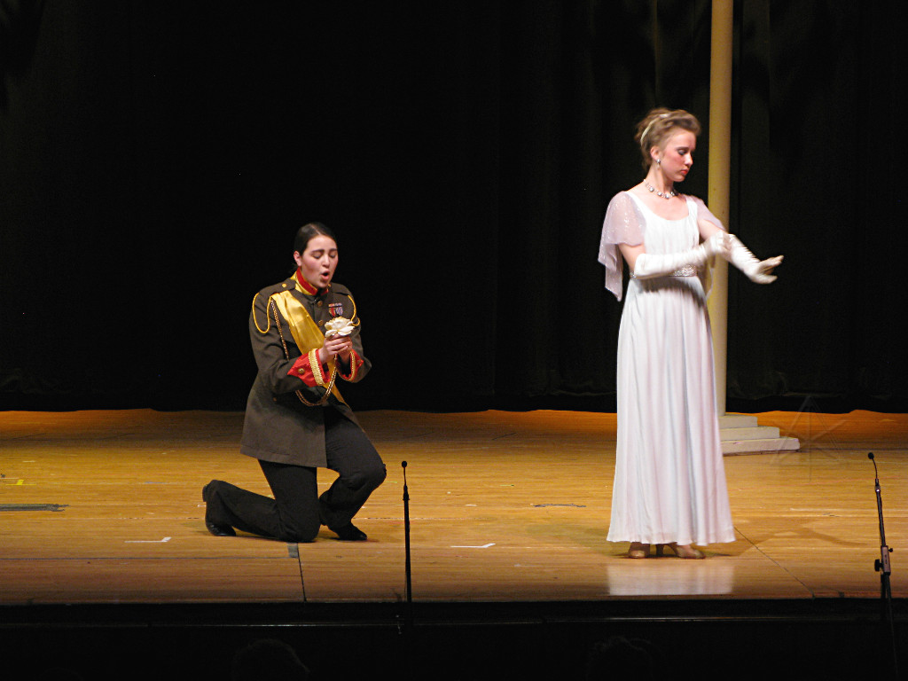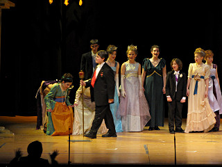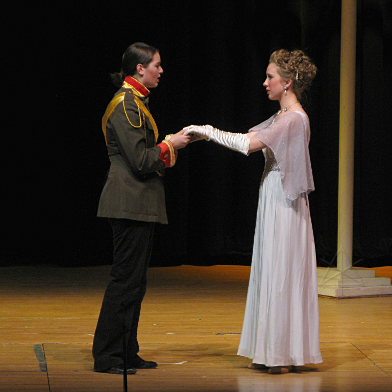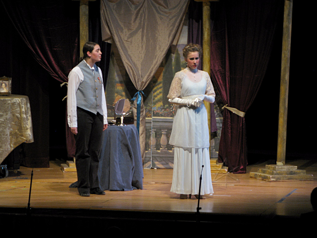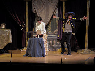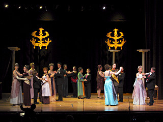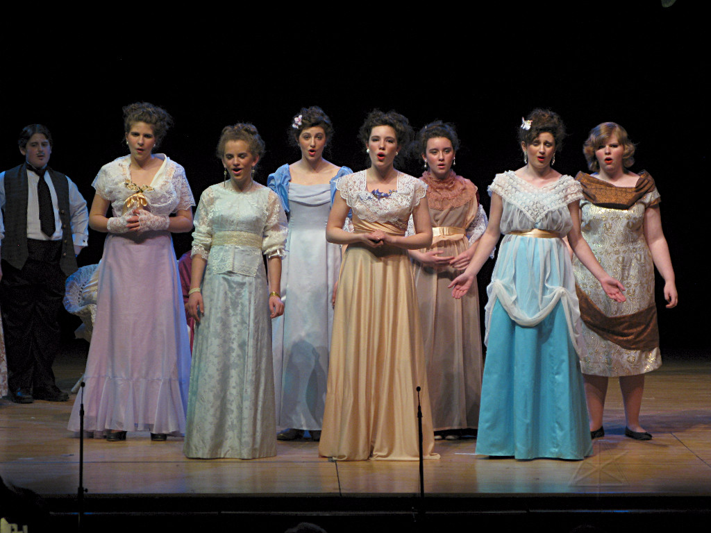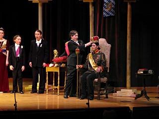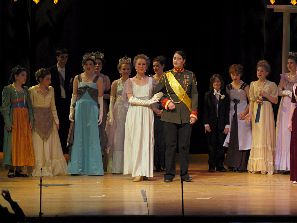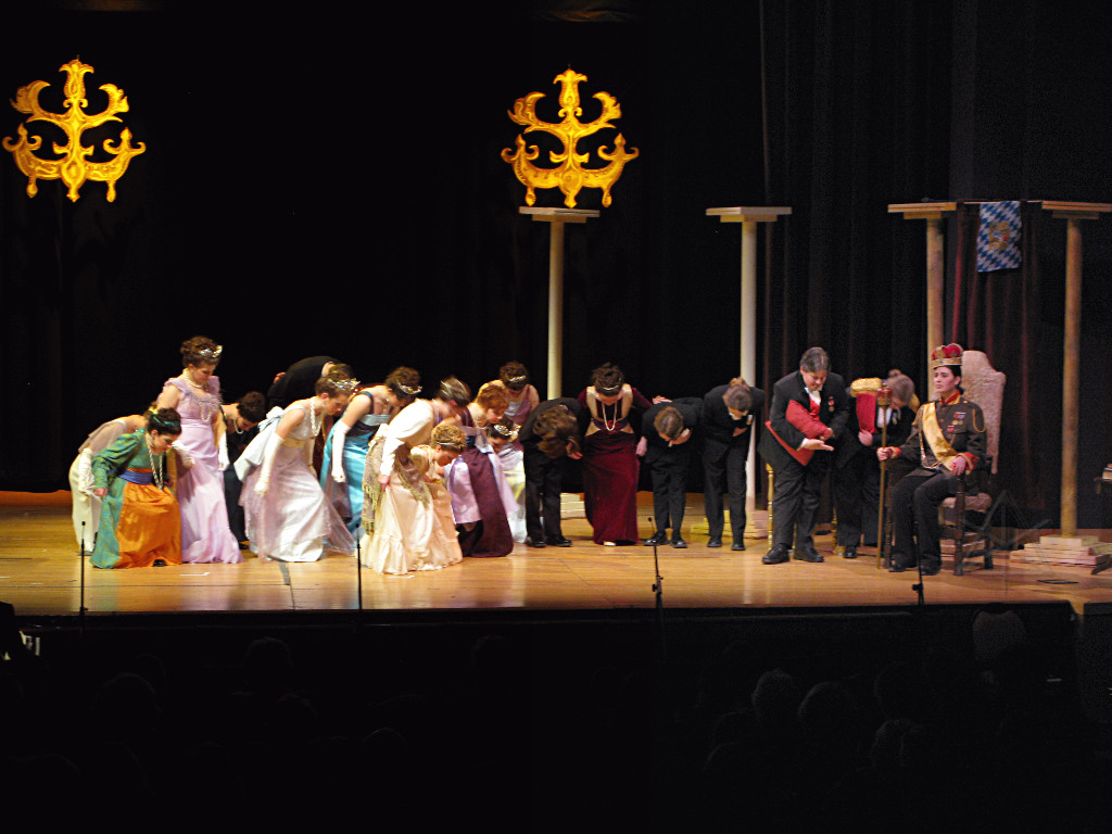 The camera's perception of the dynamic range difference is even more profound, and I had to do a lot of post-fixup in the photos to bring people out of the darkness in the back so we can see them here at all. That's why the background people look a little flat and grey sometimes -- I was desperately trying to pull a little detail out of very photographically dark regions, and there's only so much one can do and not have it look totally awful. But shooting any brighter [e.g. slower] would have not only bloomed the fore-people into white blobs, it would have let in a lot more motion blur, so staying on the dark side was deliberate. Setting a manual white-balance calibration was essential for getting the captured colors even close to right. Regular "tungsten" mode would have drifted way too far toward the pink, given the LD's gel selections, so I'm glad I went up on stage with a piece of paper to give the camera a more accurate notion of our spectrum. Even then a touch of "de-greening" was necessary here and there. Our eyes and brains adapt, but a digital camera is often very unforgiving. I will also note that my own knowledge of the story details gets pretty hazy past this point, so the commentary is kept deliberately sketchy and relies mostly on the program notes. Really, the point here is to just have the pictures available online.  |