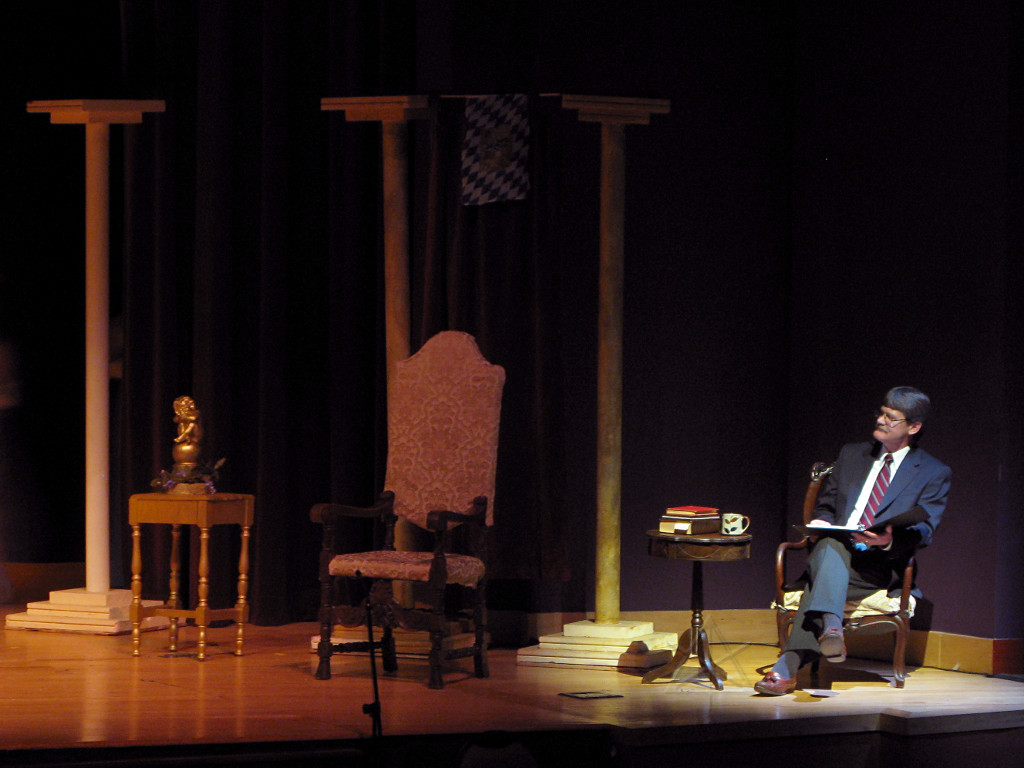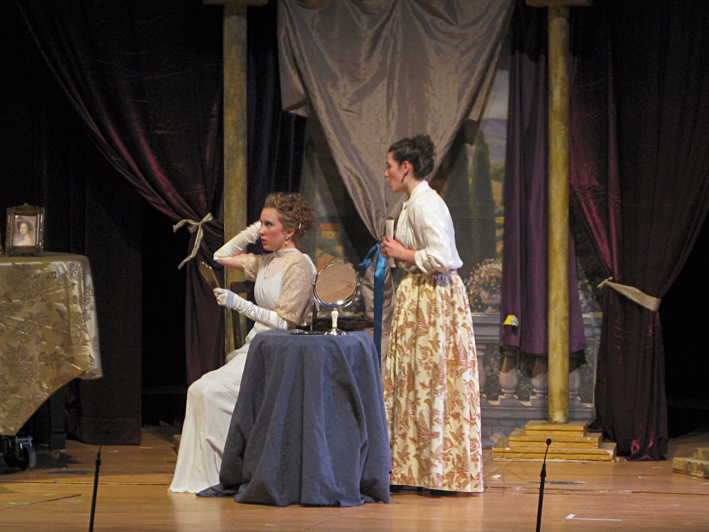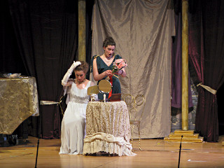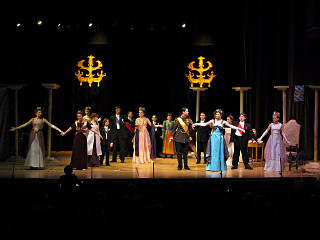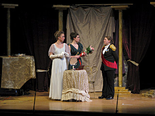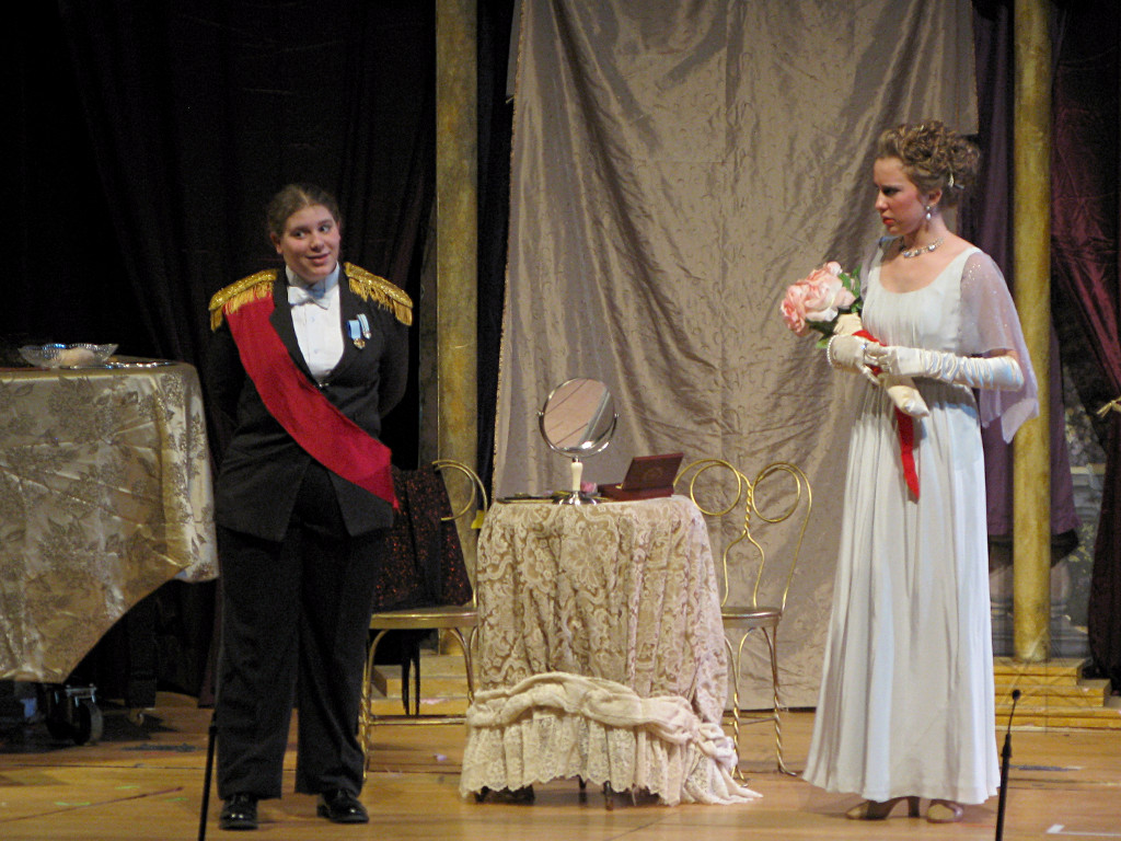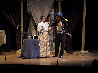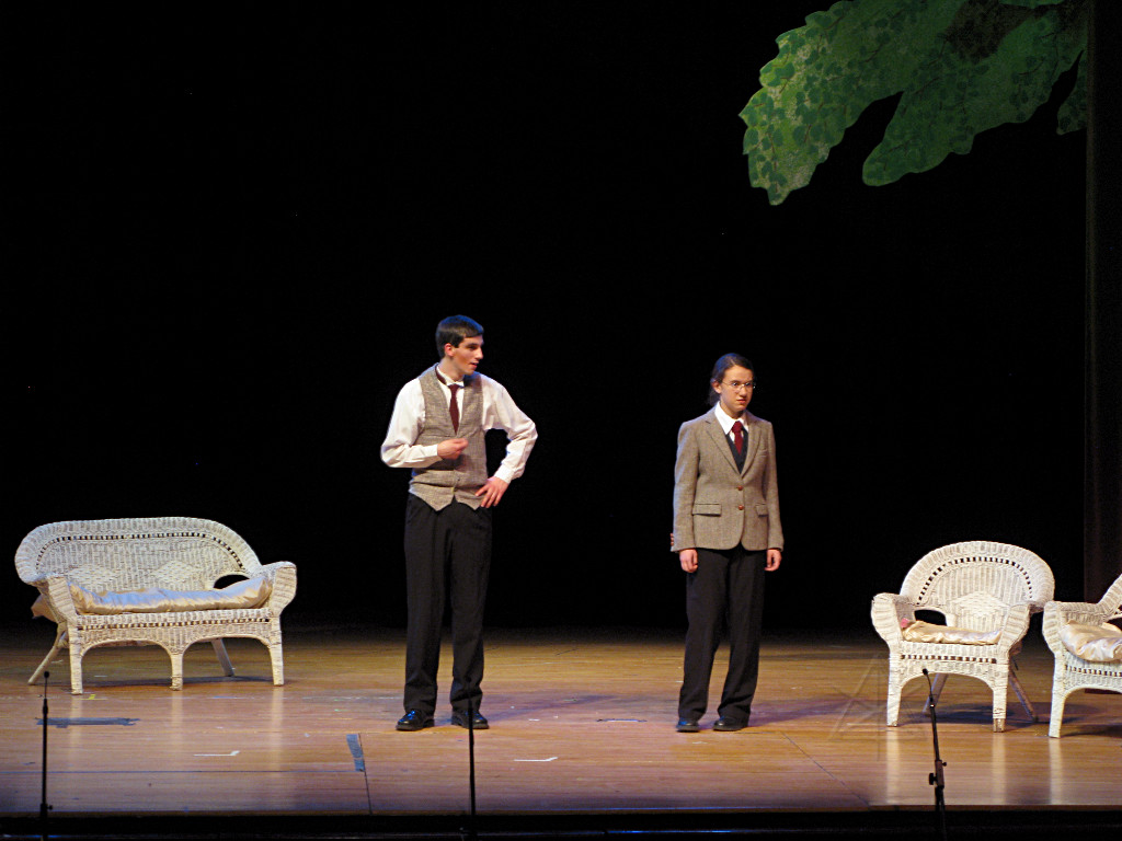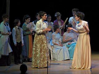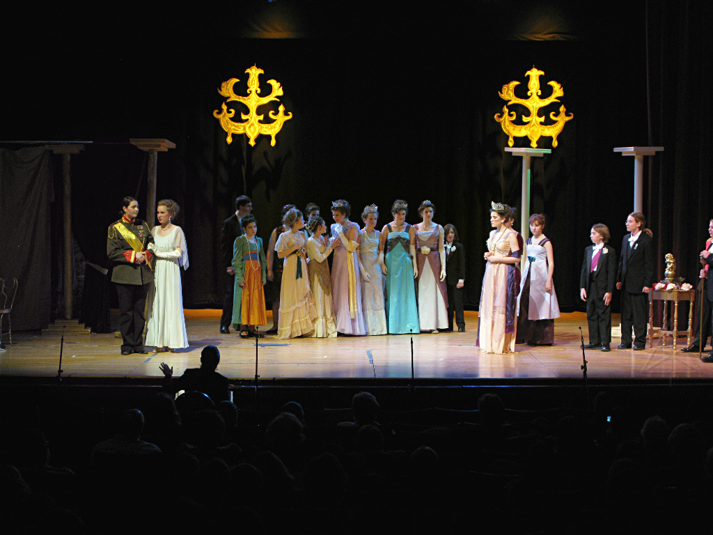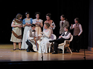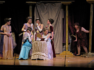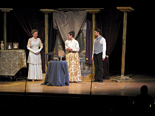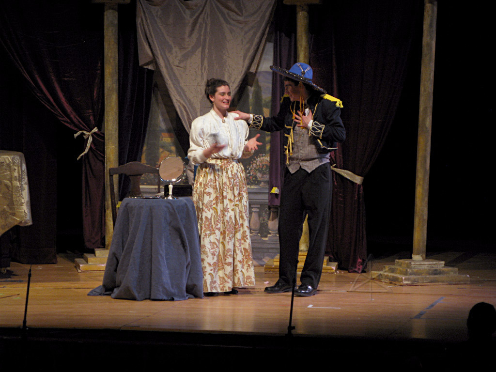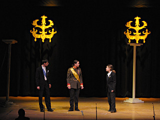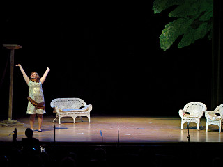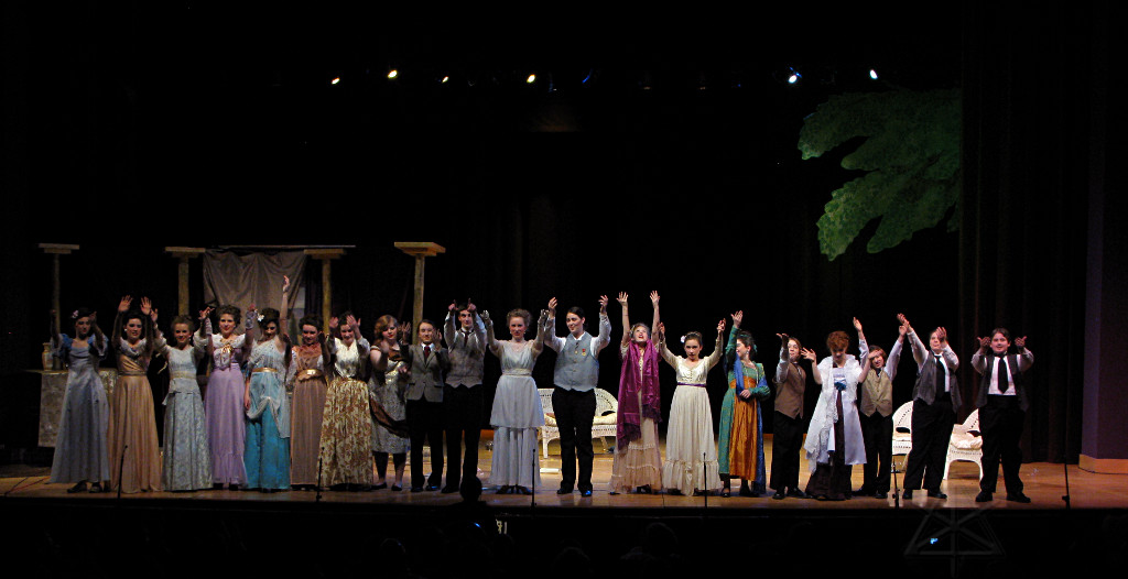 The camera's perception of the dynamic range difference is even more profound, and I had to do a lot of post-fixup in the photos to bring people out of the darkness in the back so we can see them here at all. That's why the background people look a little flat and grey sometimes -- I was desperately trying to pull a little detail out of very photographically dark regions, and there's only so much one can do and not have it look totally awful. But shooting any brighter [e.g. slower] would have not only bloomed the fore-people into white blobs, it would have let in a lot more motion blur, so staying on the dark side was deliberate. Setting a manual white-balance calibration was essential for getting the captured colors even close to right. Regular "tungsten" mode would have drifted way too far toward the pink, given the LD's gel selections, so I'm glad I went up on stage with a piece of paper to give the camera a more accurate notion of our spectrum. Even then a touch of "de-greening" was necessary here and there. Our eyes and brains adapt, but a digital camera is often very unforgiving. I will also note that my own knowledge of the story details gets pretty hazy past this point, so the commentary is kept deliberately sketchy and relies mostly on the program notes. Really, the point here is to just have the pictures available online.  |